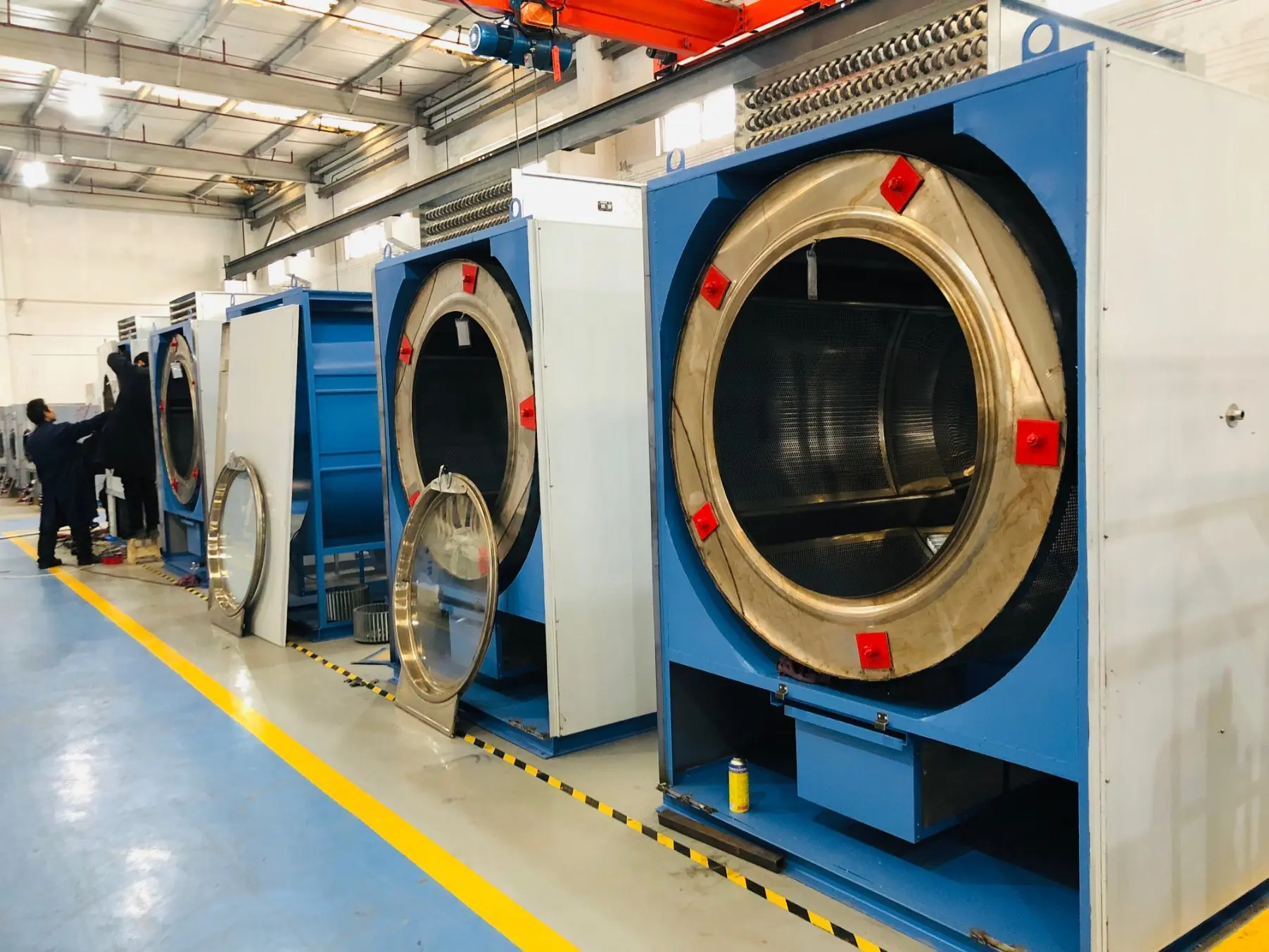 1, Heating: electrical, gas, steam, electrical and steam, coal. Operator could choose. 2, Drums are all in stainless steel, panels are in stainless steel or spray material, prevent the pollution of corrosion to fabric. 3, Large door, easy loading and unloading, opens 180°, option: left or right opening. 4, Optimal design of cooling fan, with the best heat dissipation, wind speed. 5, Fully automatic computer control the temperature, temperature control devices, over-temperature protection device. 6, Easy accessibility to the vital parts, easy service, quick replacement of the belt.