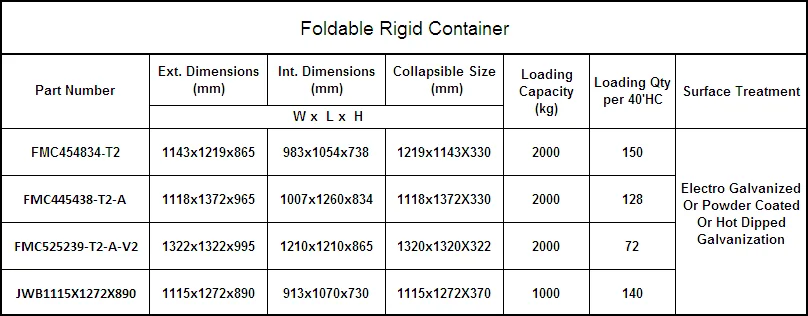 Foldable Rigid Container Stock Size List