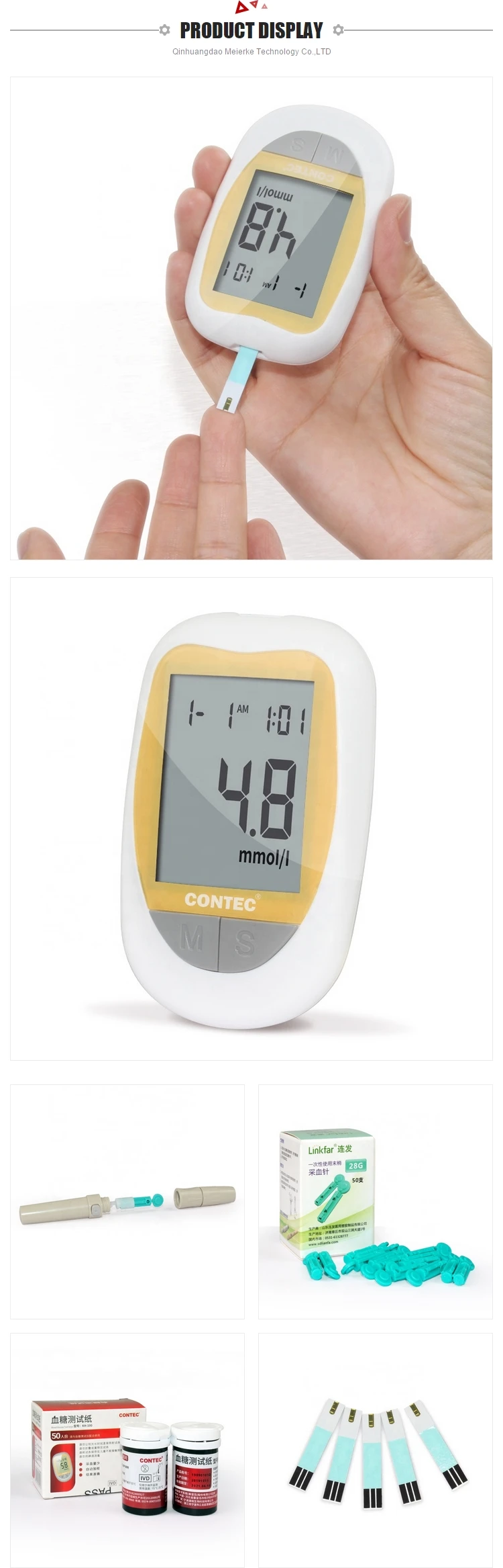 The blood glucose test strip should be used with Blood Glucose meters , and is intended for blood glucose monitoring by people with diabetes. test strips only need 1μL fresh capillary blood for one testing. Blood glucose concentration result will be showed in 7 seconds after you apply a blood sample into the test zone.