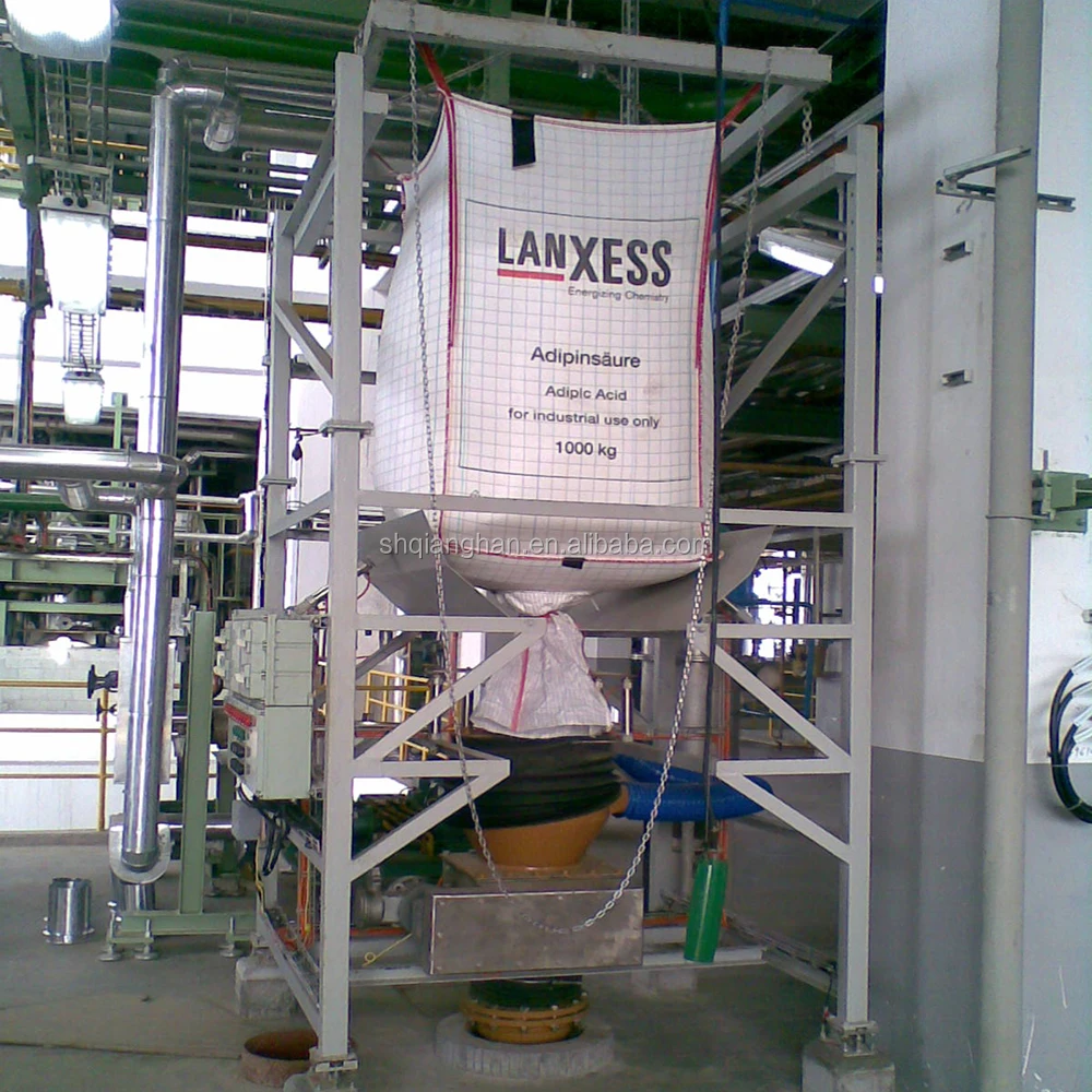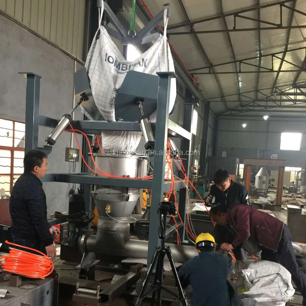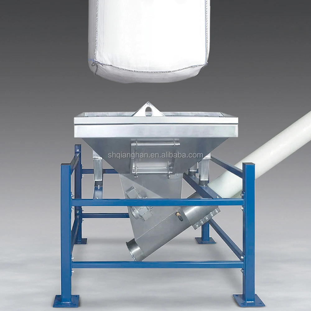 Operation process The T-Bag unloader is to lift the material bag to the feeding port by forklift or electric hoist to press the bag. After the unloading port of the packing bag is opened manually, the flow control valve and the attached vibration or beating device are opened to make the materials in the bag fall into the hopper below by self weight.
