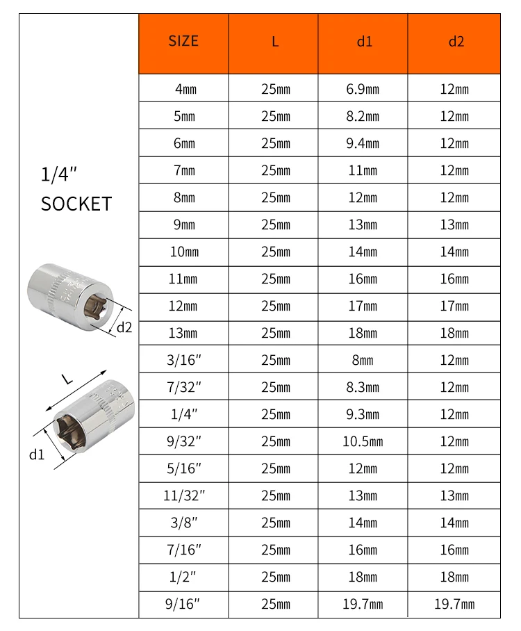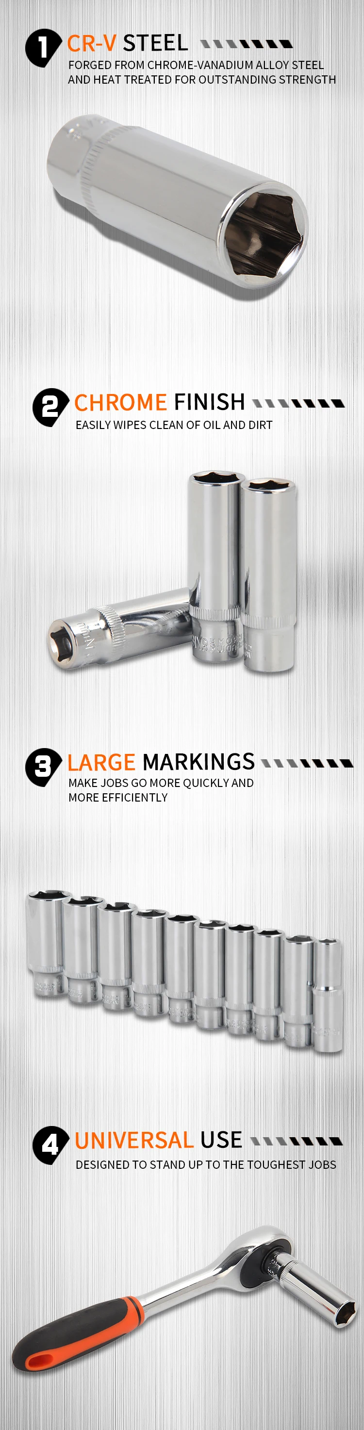 high strength chrome vanadium steel sockets provide superior torque for greater turning power