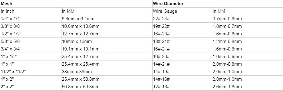 WIRE DIAMETER | hole size | Width | Length |