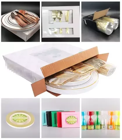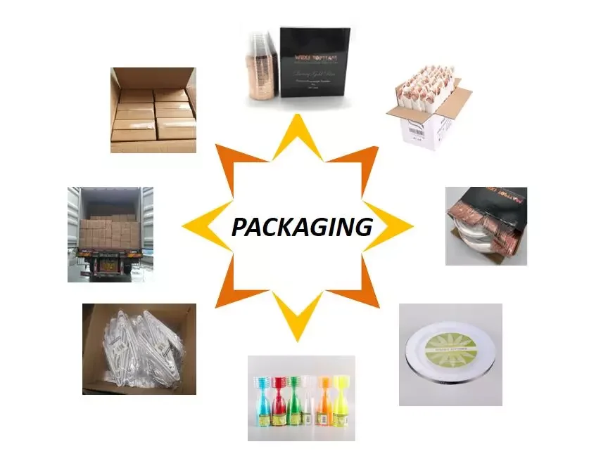 Packaging | 25 pcs 7.25'' plates, shrink pack + 25 pcs 10.25'' plates, shrink pack + 25 pcs 9 oz tumblers, shrink pack + 25 pcs knives, plain polybag + 25 pcs forks, plain polybag + 25 pcs spoons, plain polybag + 25 pcs paper napkins, totally 175pcs per box, 6 boxes/ctn |