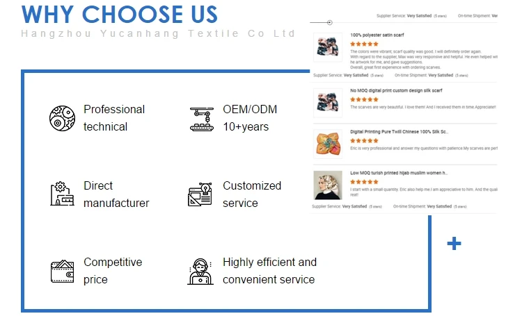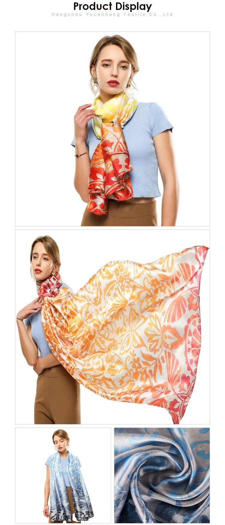 HangZhou YuCanHang Textile Co.,Ltd have more than 10 years experience for SCARF industry, She is located in SILK hometown -Hangzhou, China. Every day, thousands of scarf are fly to worldwide. Both CUSTOM MADE and WHOLESALE are workable for us. We issue the new designs every 15 days. Also we are able to provide you brand packaging of your own brand and help you to make your own exclusive brand.