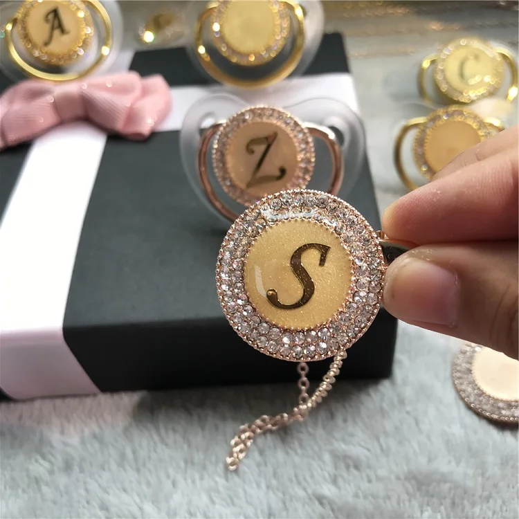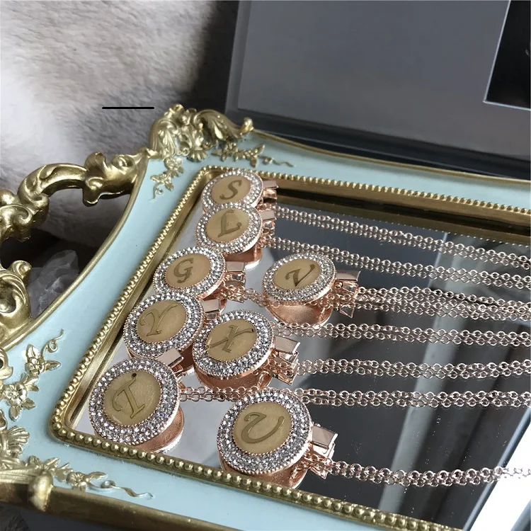 Sparkle Private Label Rose Gold Plated Metal Clip Name Pacifier Holder 26 Initial Gold Letter Rhinestone Dummy Chain for Baby