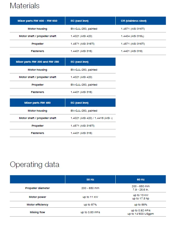 •The RW mixer range includes several submersible mixers with integral motors ranging from 1.3 to 13 kW (1.7 – 17.5 hp)