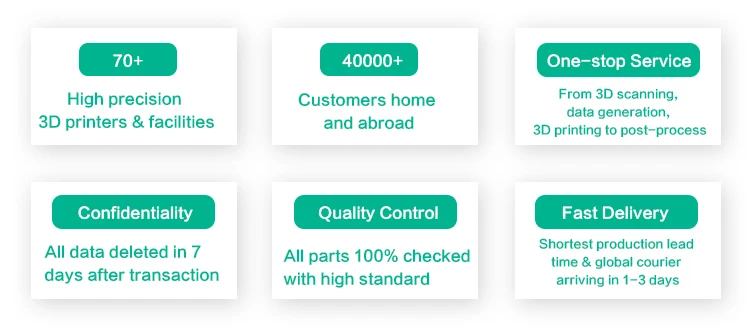 Since its founding, our company has been focusing on 3D printing, with a strict confidentiality system, and automatically deleting files a week after the completion of the order. To date our company has printed more than 400,000 parts, served more than 50,000 customers, and gained a great reputation from the customers home and abroad. Looking forward to the future, we will continue to uphold the original desire to create for the creators, serve every customer, and strive to contribute to the development of 3D printing.