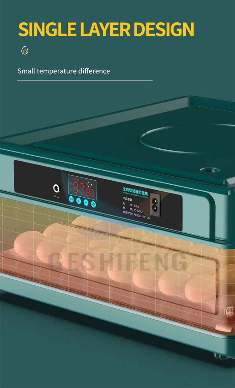 Eggs 64 PCS | Quantity:1PCS/carton Size:50*50*21CM GW :3.5KG/carton Volume:0.053CBM | 1. Power: 80W 2. Voltage: 220/110V 3. Eggs: 64 pieces 4. Function: automatic temperature control, automatic egg turning, automatic water replenishment | ||||