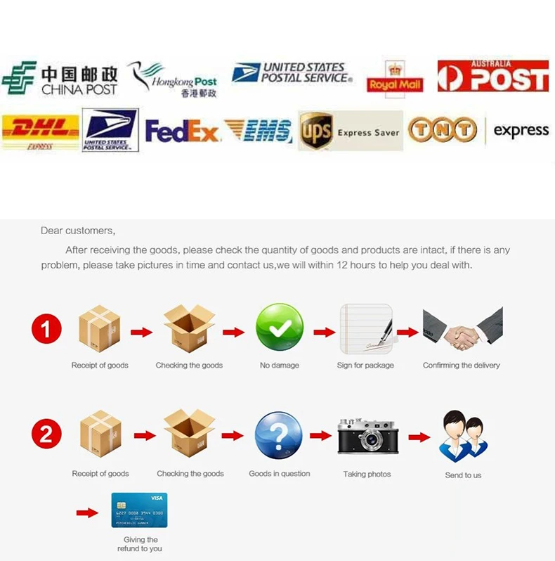 5) If the goods received are damaged, please take photos or record video at the first time, and contact us, we will give you the best solution at the first time. Please return the goods according to the following process.