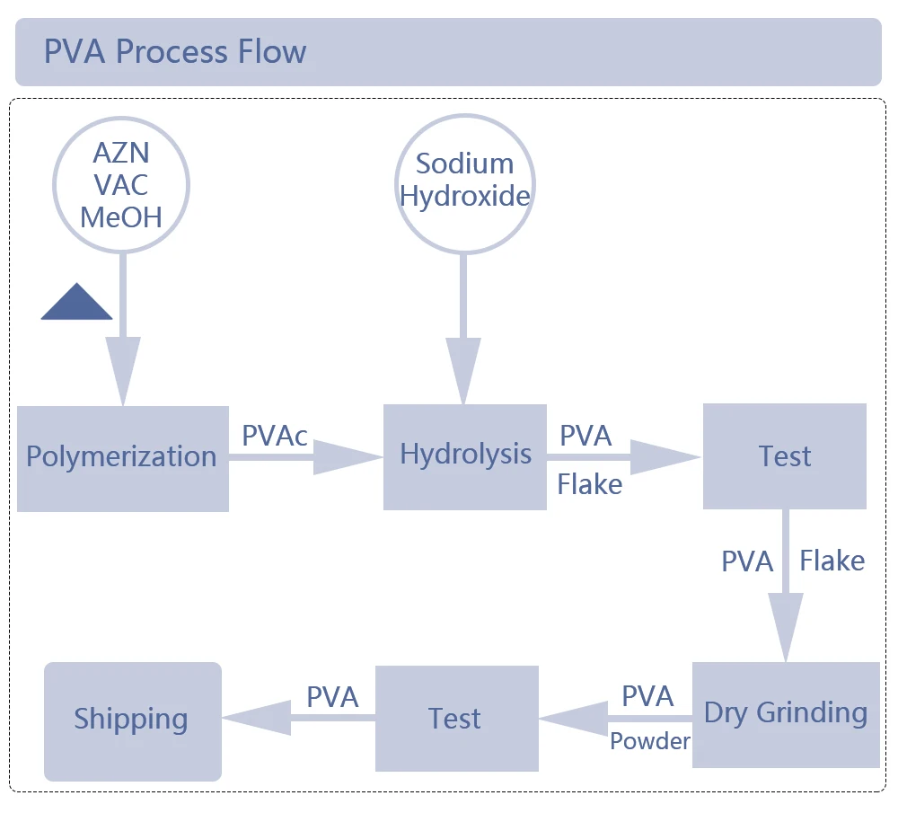 Add water at room temperature in the dissolving tank. Start the agitator, slowly add calculated amount of PVA into the tank. Keep PVA swelling in the water at room temperature for about 30min, and then raise the temperature of the PVA aqueous solution, when the temperature reaches 90-95℃, keep the temperature for 1-2hours. PVA can completely dissolve.