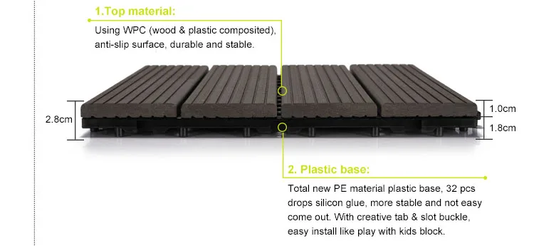 KEY FEATURE-Durable, non slip (slip resistant, anti slip), waterproof,hard wearing for all outdoor tiles -No Tools & No Skill Needed, quick install, convenient, eco forest friendly. -Removable, water Drainage, rustic floor tile -No Maintenance needed -Bug free, recycled, voice heat absorption. -Various material and style(wood look, wood imitate, modern,luxury and elegant) , over 200 new modeling floor tile for choose