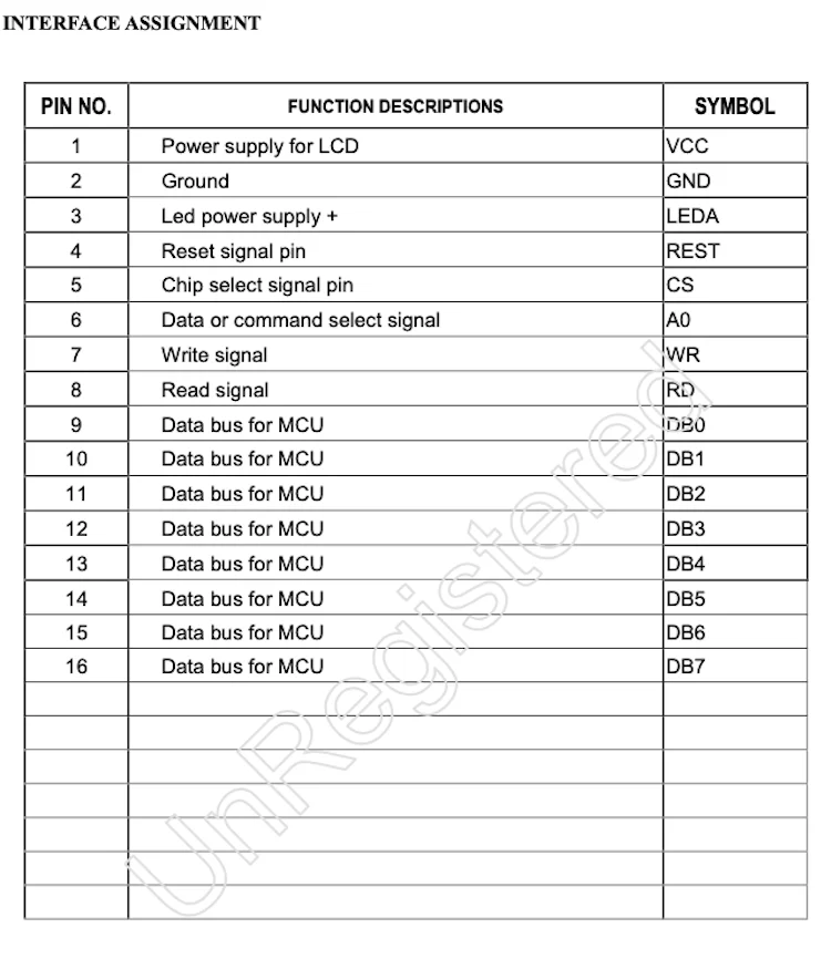Viewing Direction | 12 O'Clock | Interface | 16 Pin |