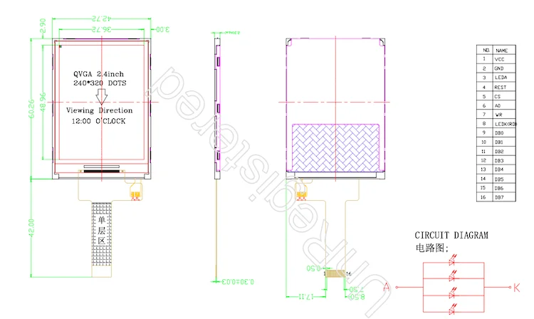Outline Dimension | 42.72(W) x60.26(H) x2.3(T) mm | Drive IC | ILI9341 |