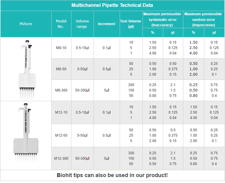 Picture | Model | Volume range | Testing volume (ul) | Inaccuracy | Imprecision | Increment (ul) | Tips Volume |