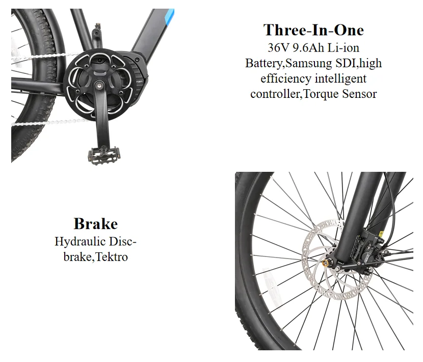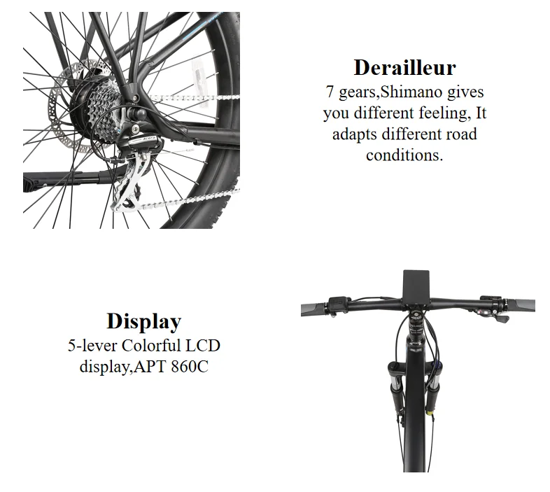 Battery | 36V9.6AH/10.5AH Lithium battery, Panasonic SDI | Derailleur | 7 gears,Shimano | ||