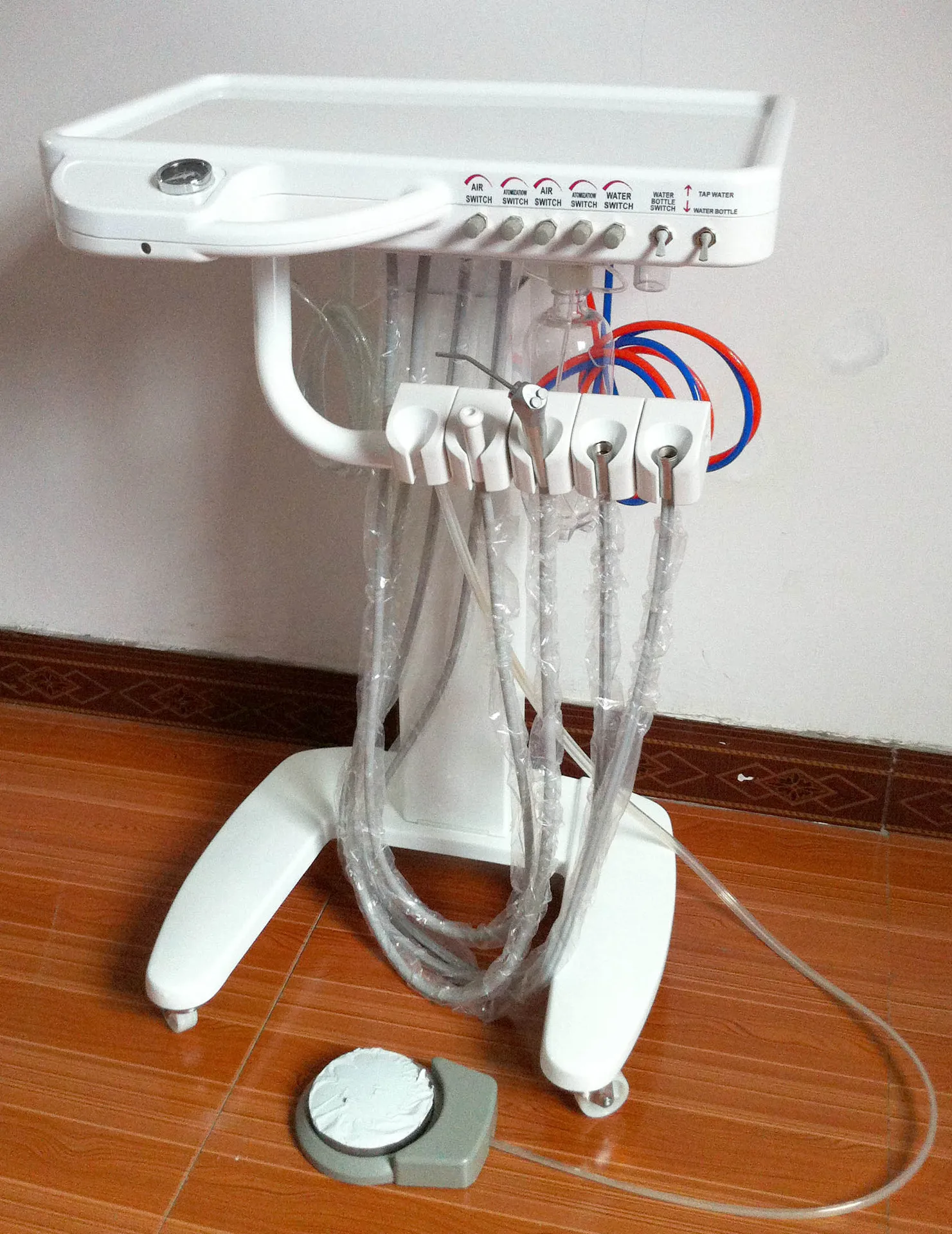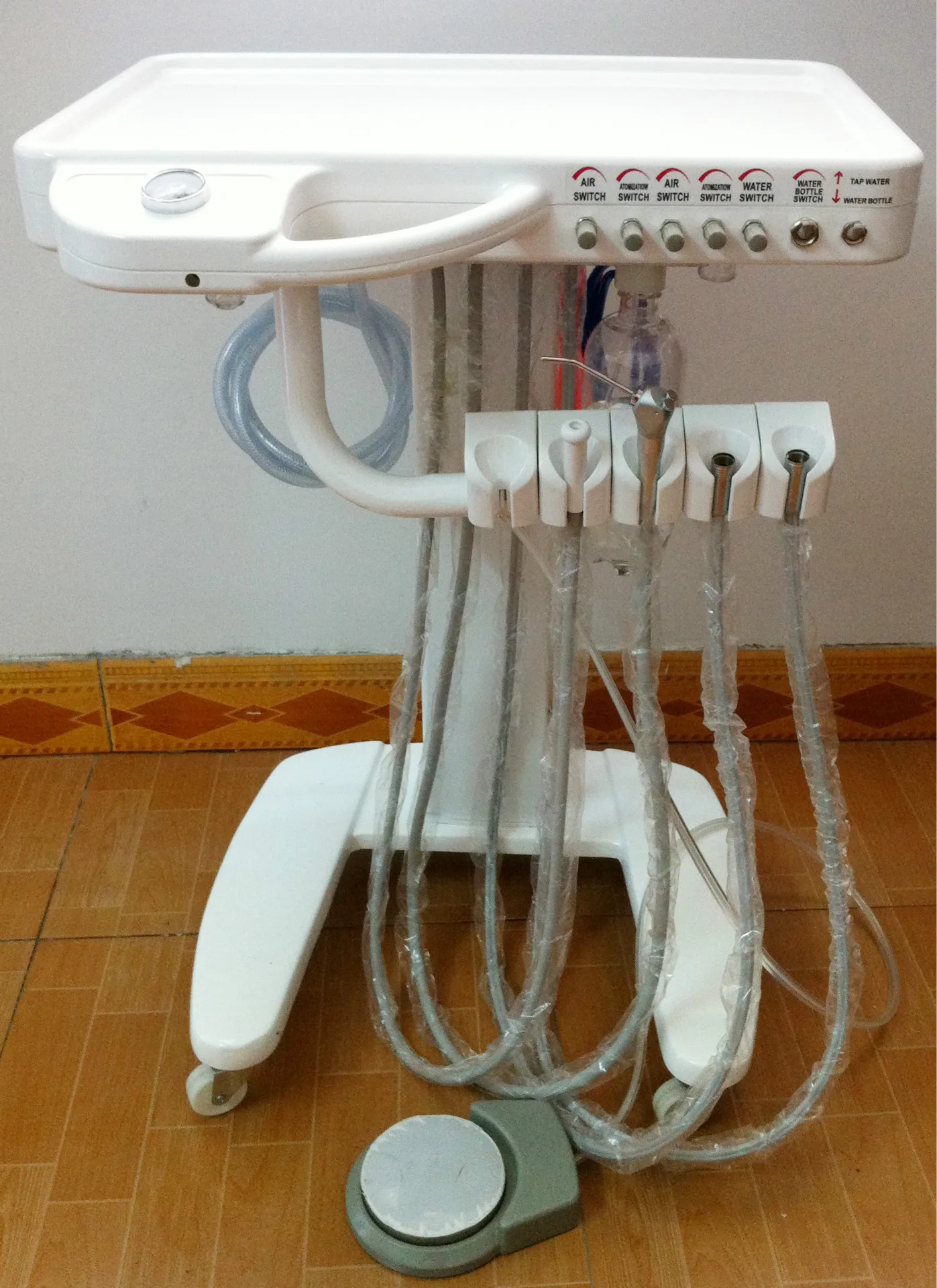 Standard Accessories Saliva ejector.....1set 3-way air/water syringe .....1set High speed air turbine Handpiece tube .....1set Low speed air turbine Handpiece tube.....1set Clean water bottle 600ML .....1set Foot pedal .....1set
