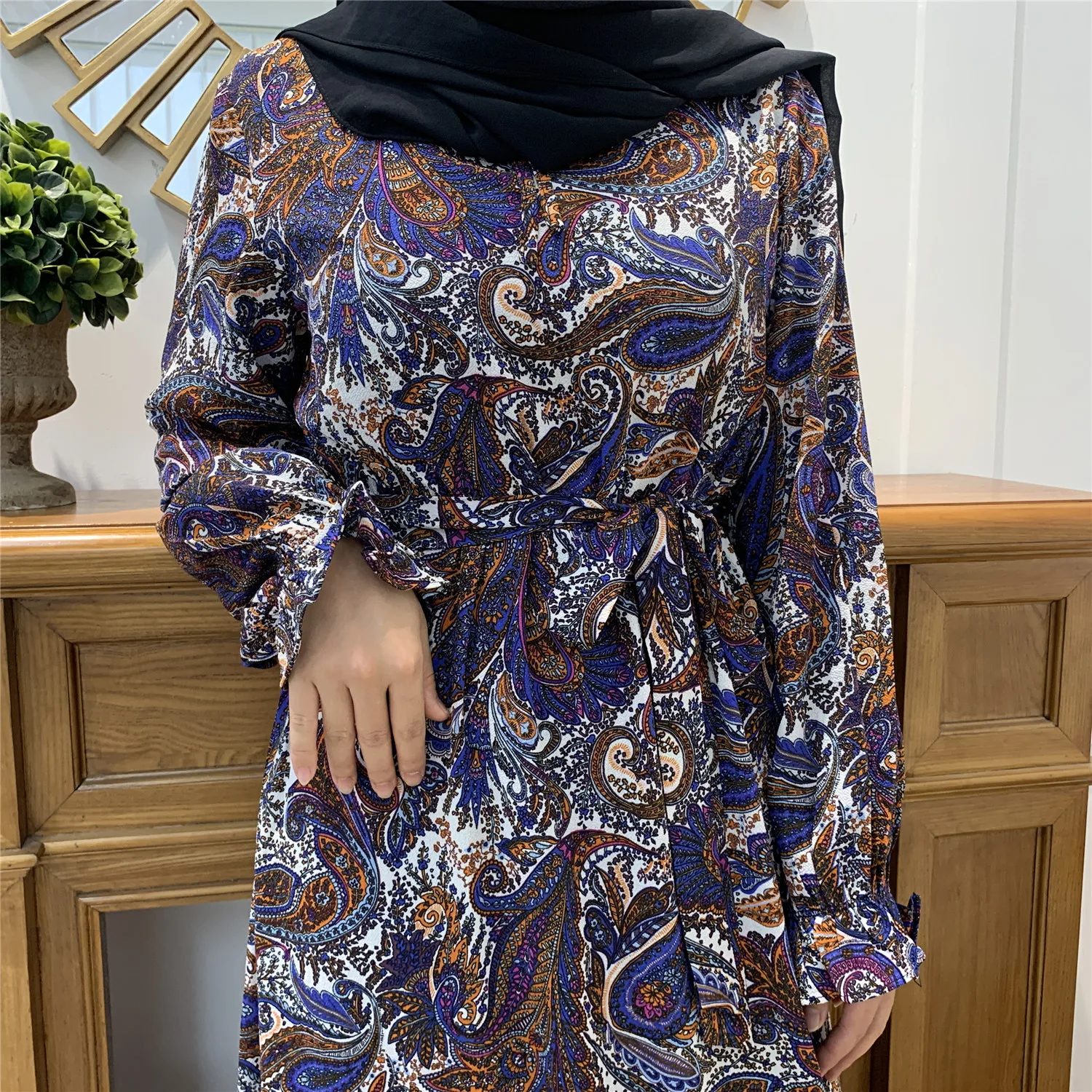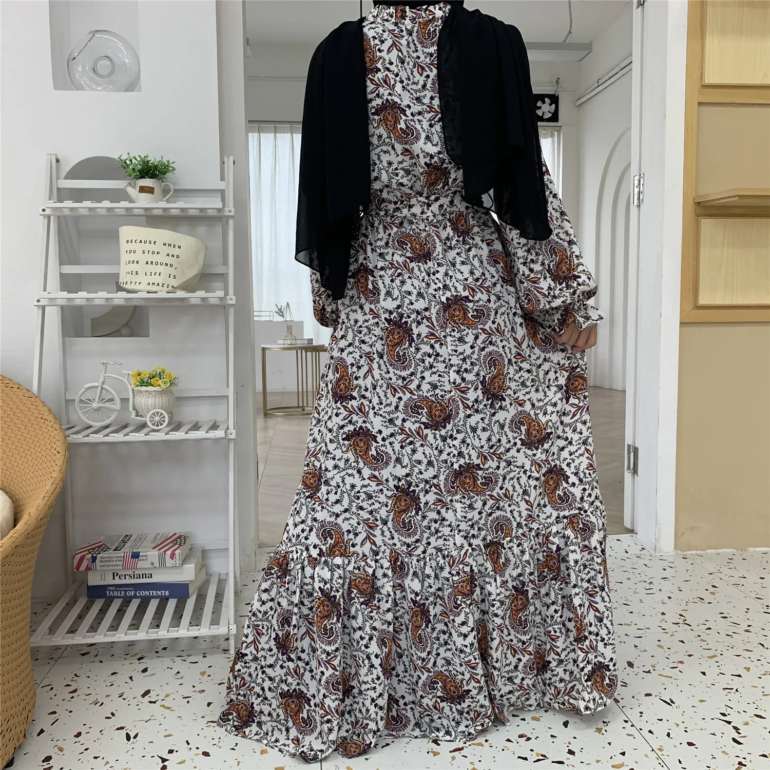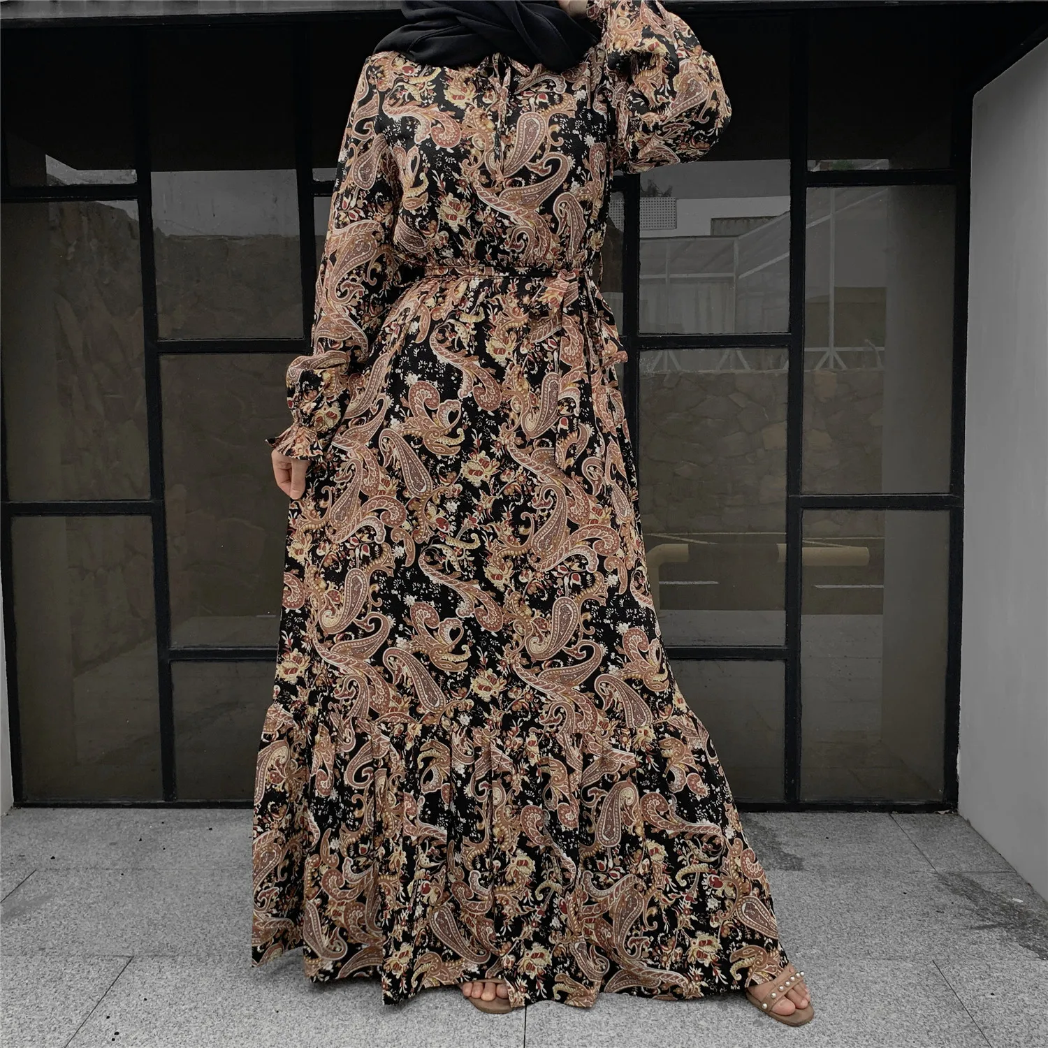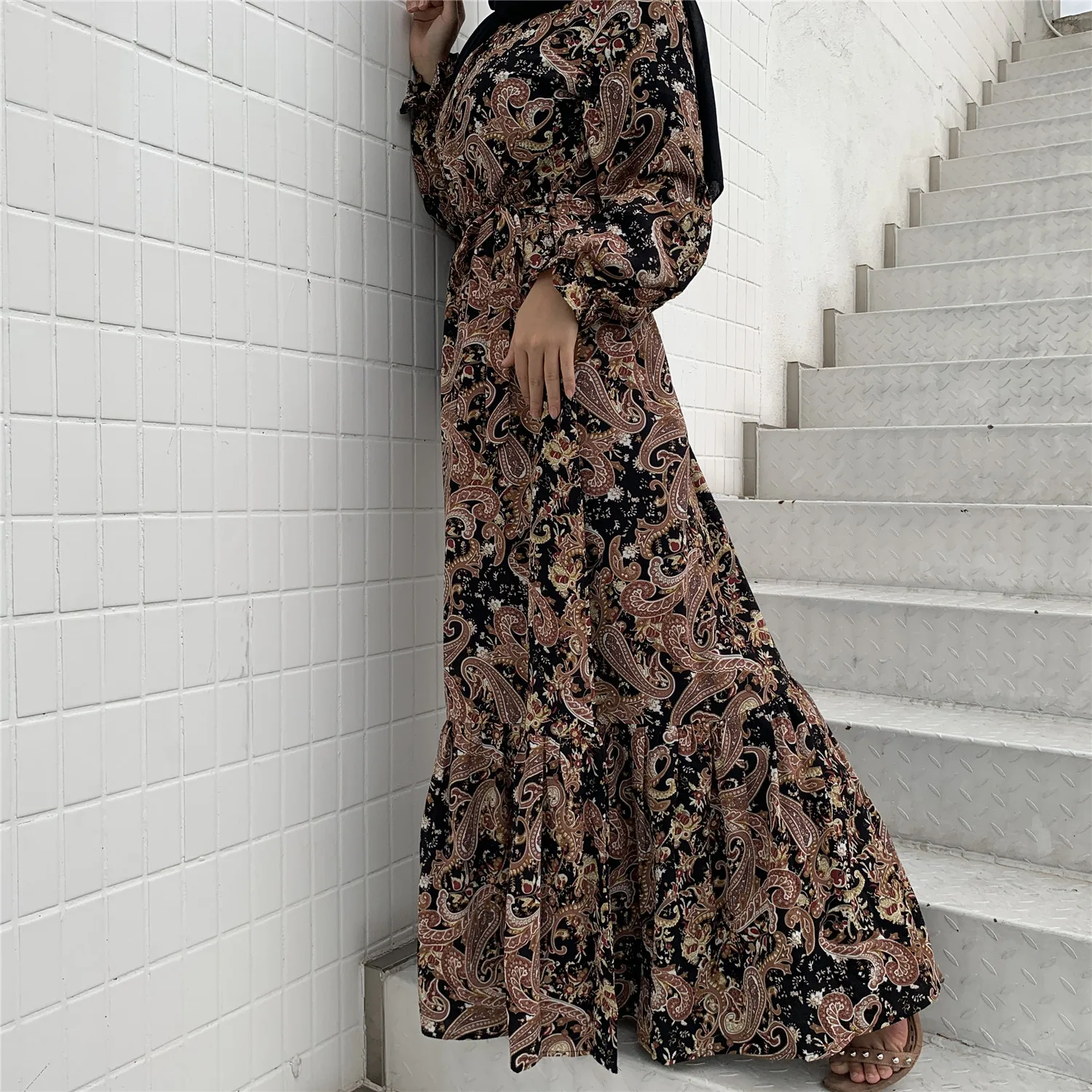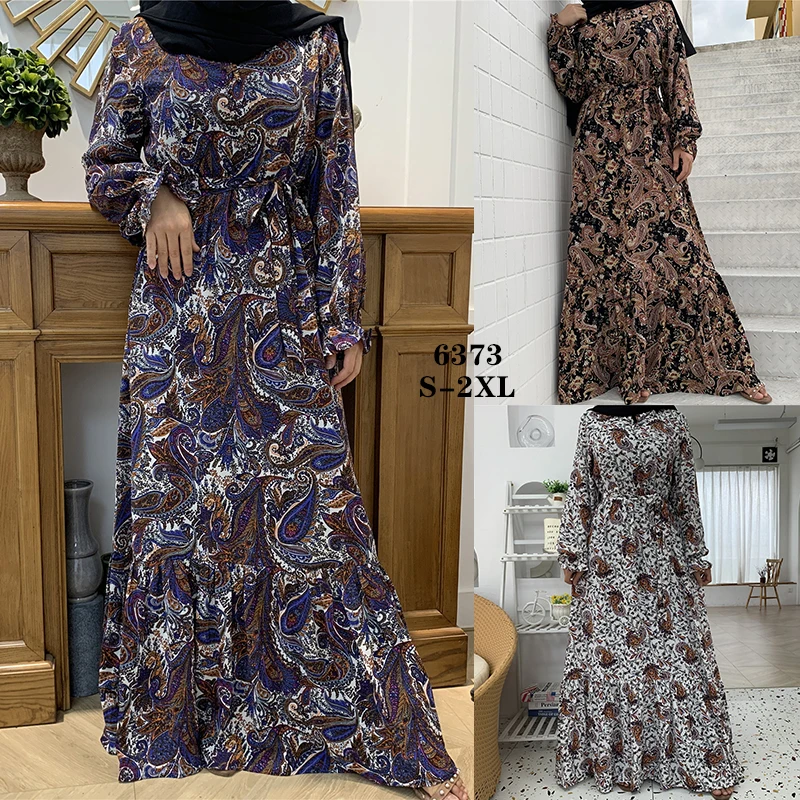 6373#Newest Floral Printed Long Chiffon Islamic Clothing Muslim Abaya Women Maxi Dresses