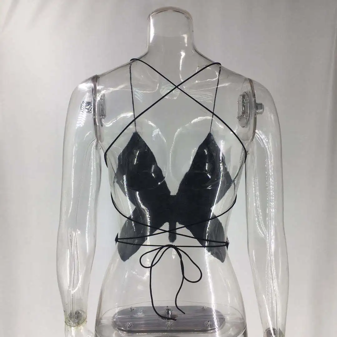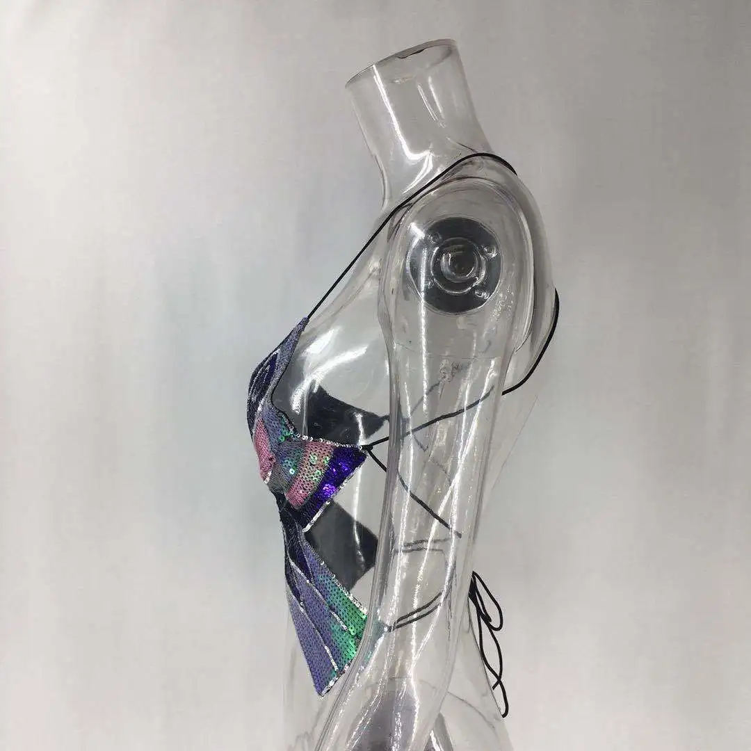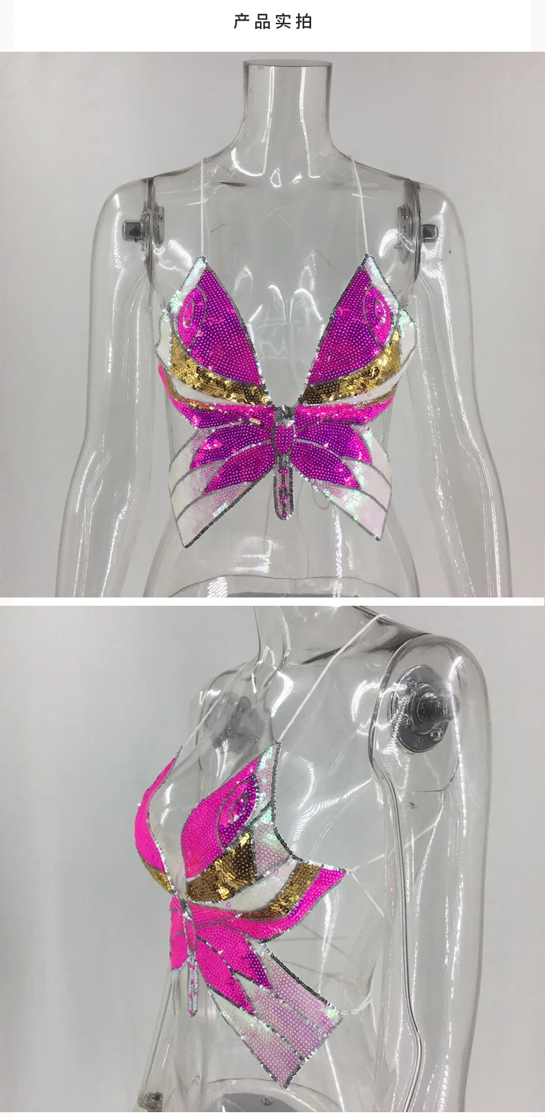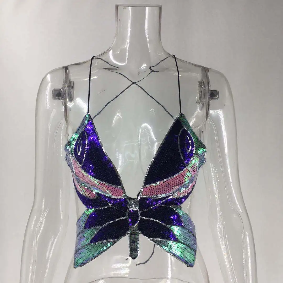 | *Product Name: | #RS417 2020 women hot style Summer colorful butterfly sequins top Sexy backless V-Neck halter crop top |
