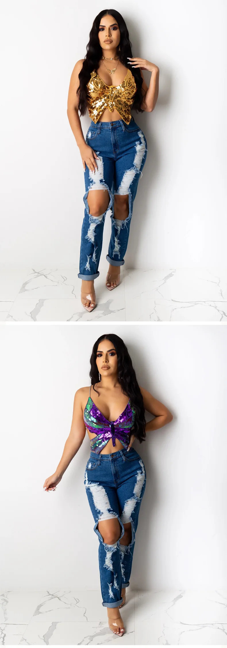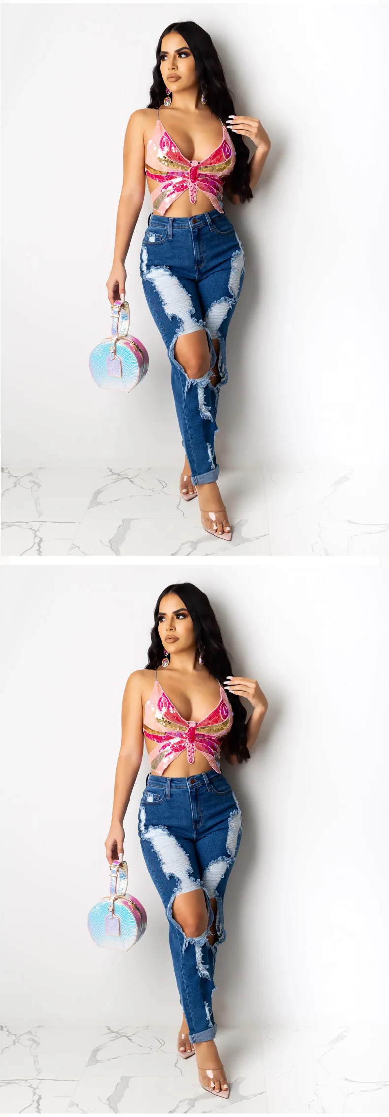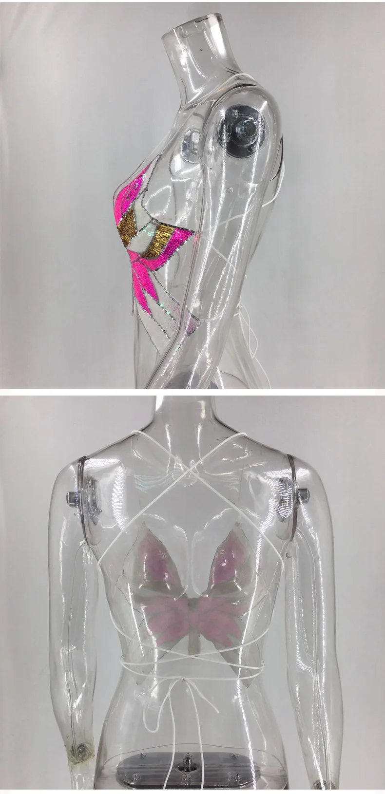 | *Product Name: | #RS417 2020 women hot style Summer colorful butterfly sequins top Sexy backless V-Neck halter crop top |