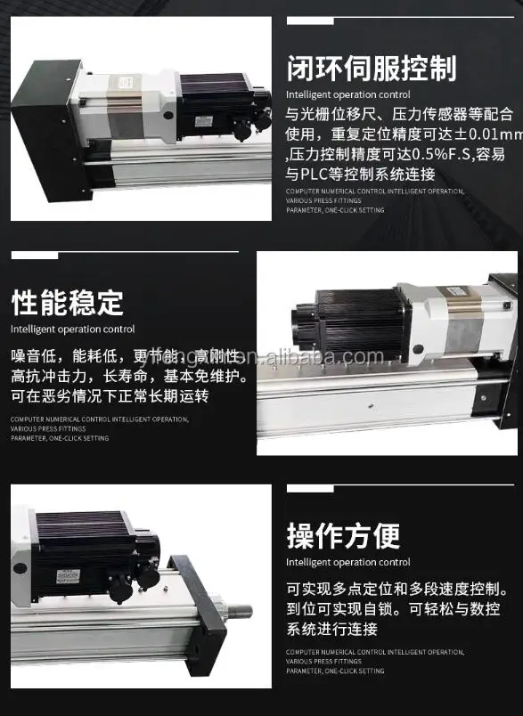 1. Closed loop servo control When used with grating displacement ruler and pressure sensor, the repetitive positioning accuracy can reach ± 0.01mm, and the pressure control accuracy can reach 0.5% F.S. it is easy to connect with PLC and other control systems. 2. Stable performance Low noise, low energy consumption, more energy-saving, high rigidity, high impact resistance, long service life, basically maintenance free, can operate normally for a long time under harsh conditions. 3. Easy operation It can realize multi-point positioning and multi-stage speed control. In place can realize self-locking. It can be easily connected with CNC system.