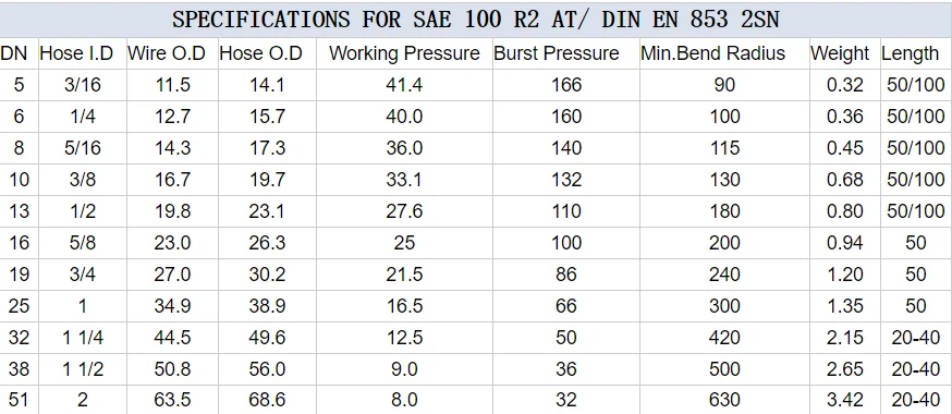 Recommended For : High-pressure hydraulic lines. Meets or exceeds the requirements of SAE 100R2AT performance requirements of EN853 2SN. Application Fields : For high pressure hydraulic systems in industry and agriculture. Tube:Black, oil resistant, synthetic rubber. Reinforcement:Two braids of fiber reinforcement. Cover:Black, oil, abrasion and weather resistant, thin synthetic rubber. Temperature Range:-40℉ to +250℉ (-40℃ to +121℃)