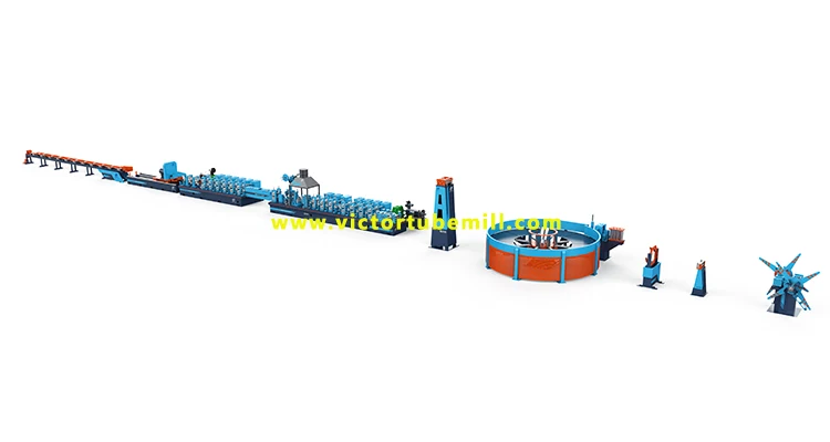 {steel strip} --- un-coiler --- (opener & straightener & pincher & leveler) --- strip-head shearer & butt welder station ---vertical cage accumulator or horizontal spiral accumulator loop --- forming M/C (main driving unit + flattening unit + breakdown section + fin pass section +seam guiding stand + high frequency induction welding system + squeeze welding roller stand + outside scrafing unit + horizontal ironing stand) --- emulsion cooling section --- sizing M/C (main driving unit + sizing section + speed testing unit + straightener + pull-out stand) --- CNC flying saw under computer control --- conveyor table.