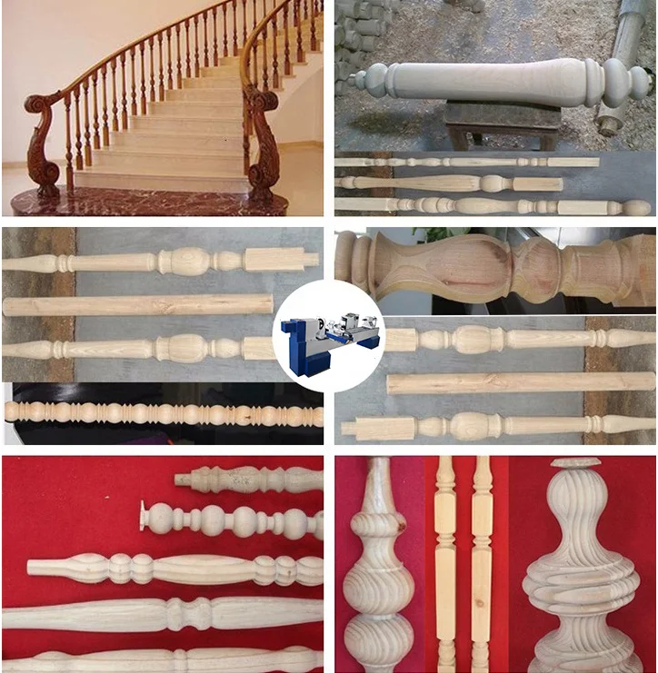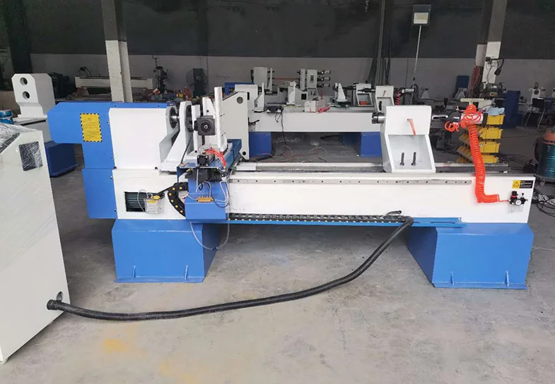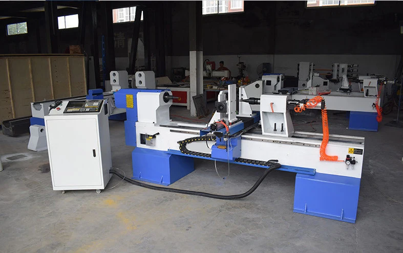 Wood lathe machine is used for wood cutting. it can realize arbitrary rotor turning processing with coordination between the longitudinal axis and horizontal axis, then can realize milling, engraving, guarantee the processing product rotational stability,high cutting efficiency. Suitable for stair column, curved round, vase, table and chair legs, European furniture Roman column,wooden hangers, washbasin, etc.; cylindrical, conical, curved, spherical and other complex shapes of revolving wood products or wooden semi-finished products . 1.Horizontal flat bed structure; 2.The spindle drive is variable frequency stepless speed regulation; 3.The X/Z axis adopts stepping drive; 4.The bed rail is a high-precision linear guide; 5.Precision ball screw, automatic forced lubrication; 6.Double-station tool holder, rough car, fine car completed in one time; 7.The control system adopts mature CNC controller, 12-inch color screen, international standard 8.CNC language G code, supports avariety of software, and supports technical function expansion.