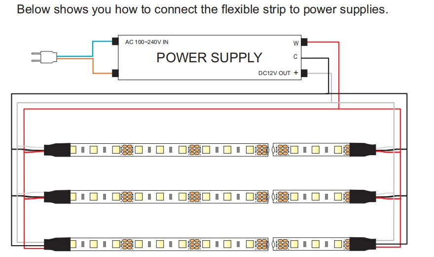 Below shows you how to connect the flexible strip to power supplies