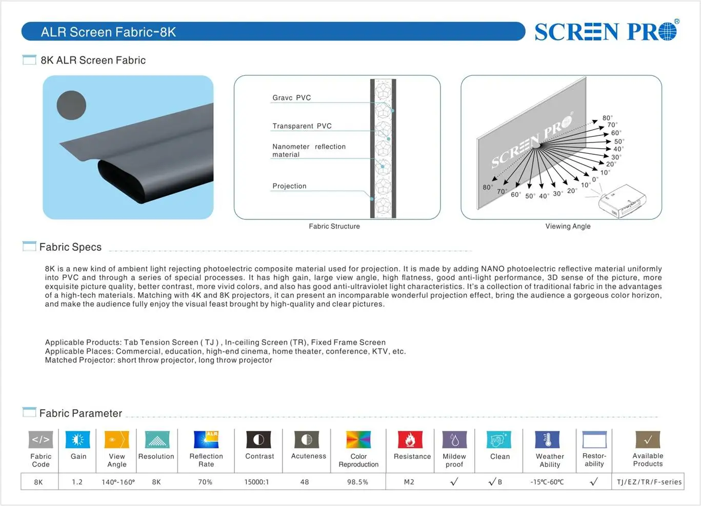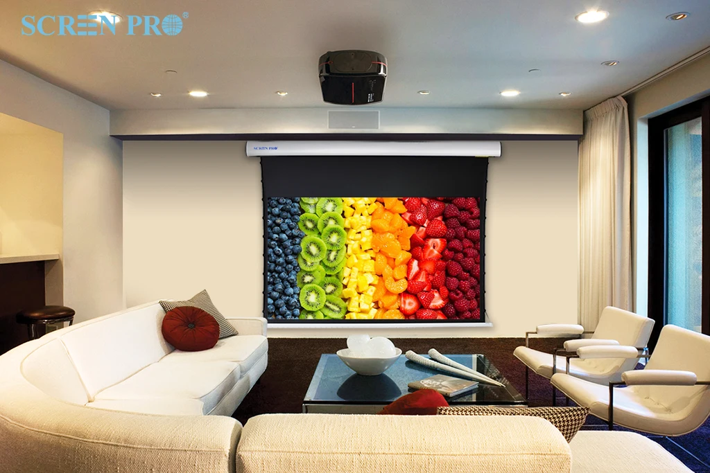 SCREENPRO ALR PROJECTOR SCREEN With a nearly perfect viewing angle of 178 degrees and big size range ( 100 "-150"), our T Prism ALR screen is capable of being viewed from extreme off axis positions even during day time with ambient light. Customers can enjoy dynamic, colorful media without losing valuable wall space by its rollable design.