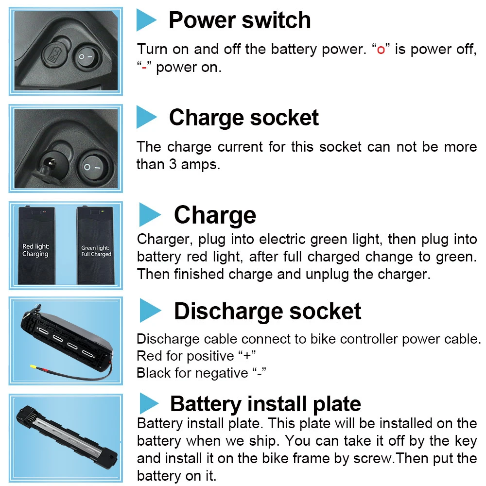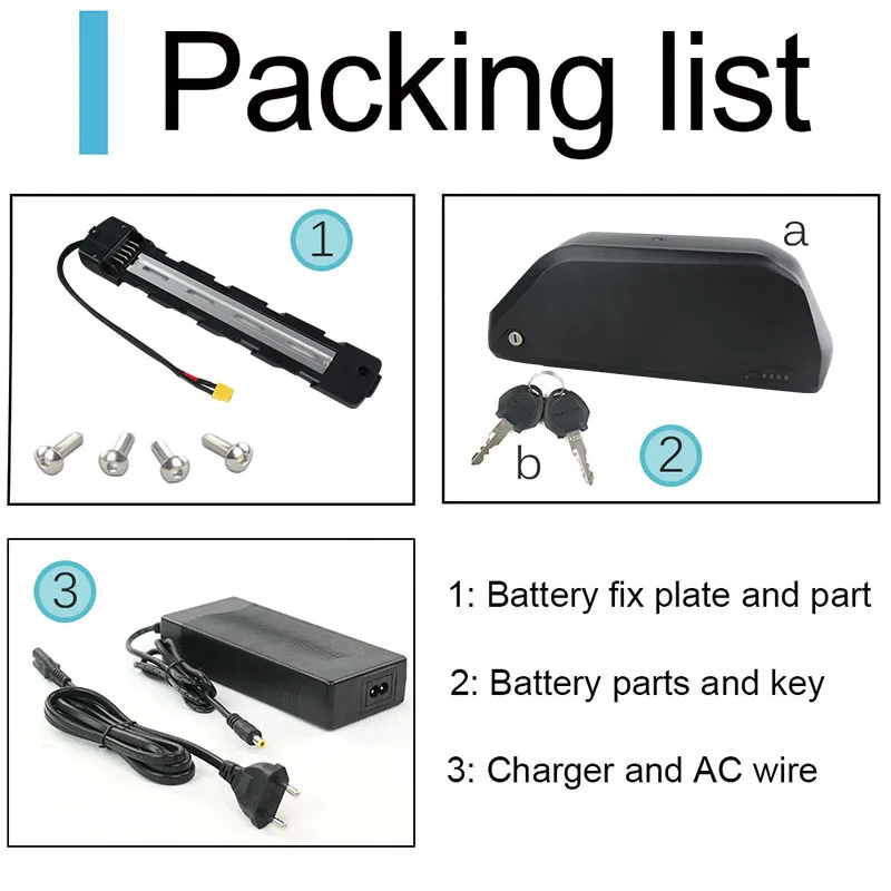 1. Electric bicycle batteries with US EU UK AU charger AC plug,it will be matched as delivery country if without request.