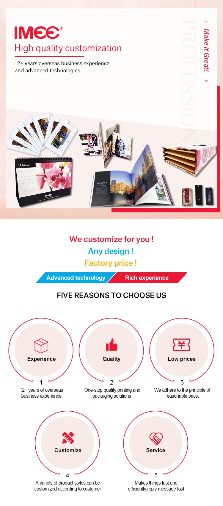 Finishing | Glossy lamination, Matte lamination, High Glossy UV varnish,UV coating, Aqueous coating, Spot UV,UV glittering, silk screen glitter powder printing, Frosting, Embossing textures and patterns,Glossy and matte wrinkle vanish, Anti-counterfeiting Finishes,Flocking,Grainning, Logo embossing or debossing, Gold/silver or other colours foil hot stamping. | |