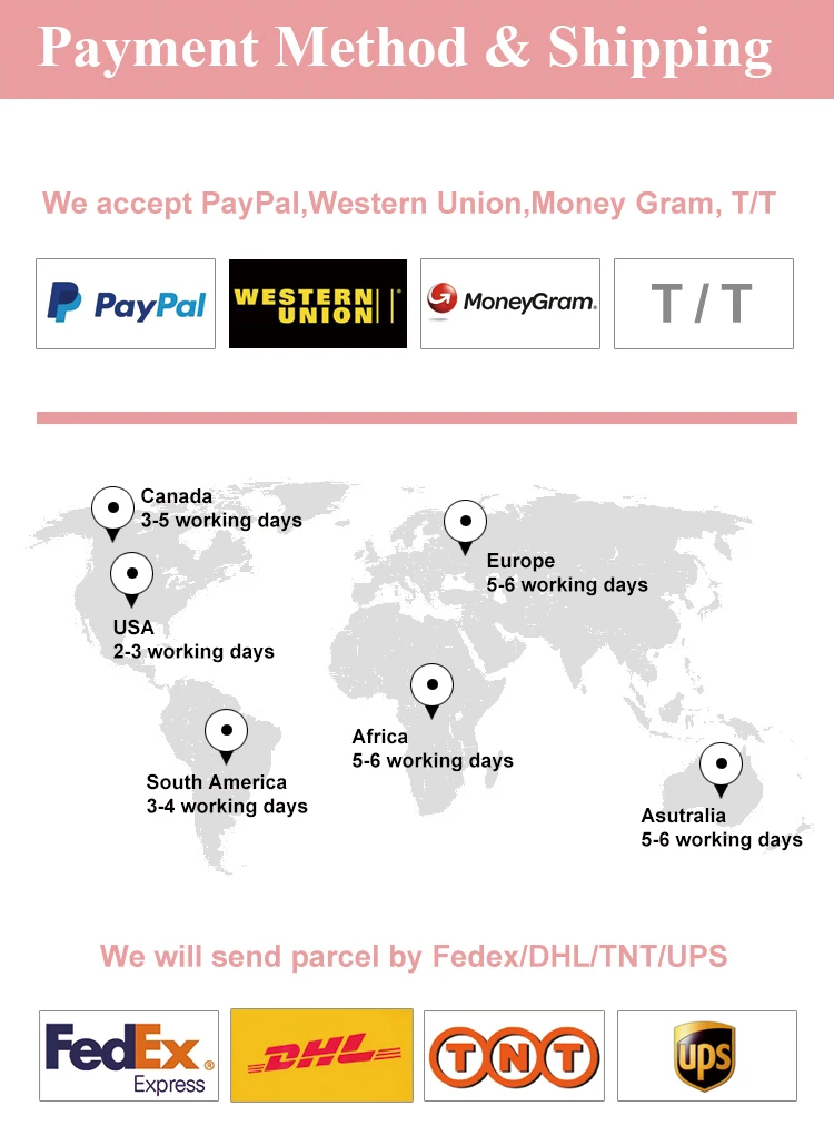 Delivery time | 3-4 Working days to USA/CA, 5-7 working days to European countries, 7-10 working days to African countries. | |