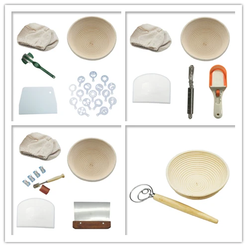 Texture | Basket: rattan Lame: wood&steel Scraper: steel+wooden handle Oil Brush: silicone Dough whisk:oak&steel Cotton Bag:cotton | size | Basket:23*8.5cm Lame:14.8*3.5cm Scraper:15*11cm Oil Brush:21*8.5cm Dough whisk:33*8cm Cotton Bag:30*33cm |