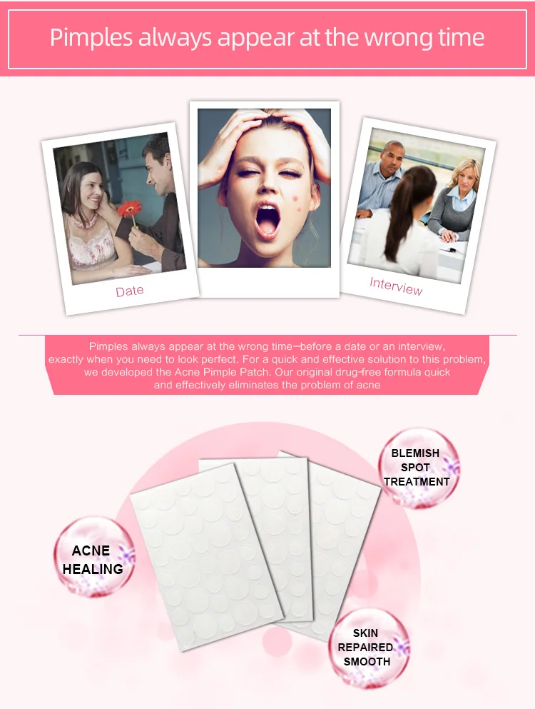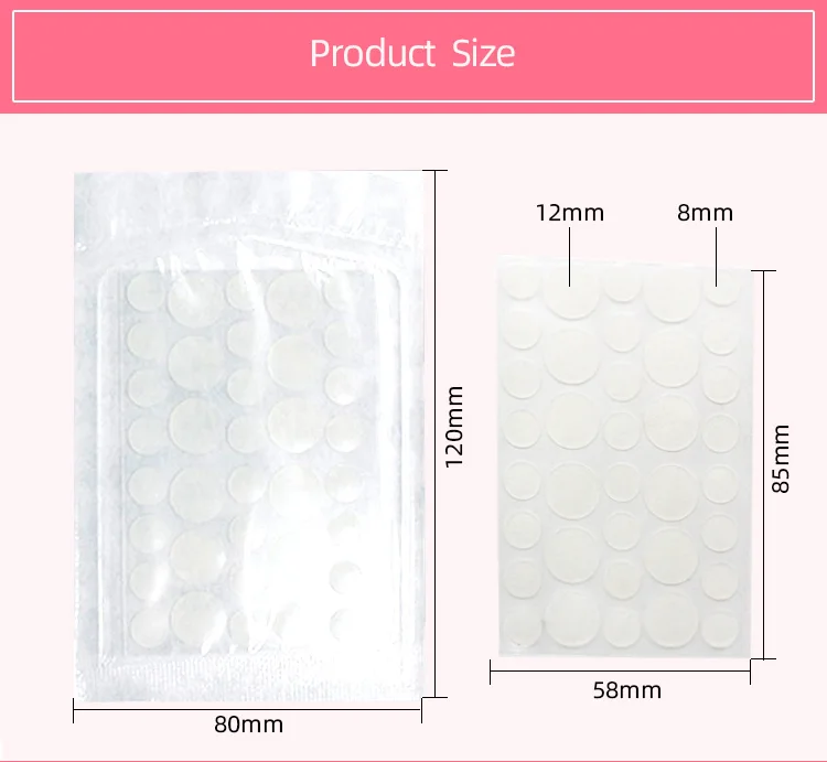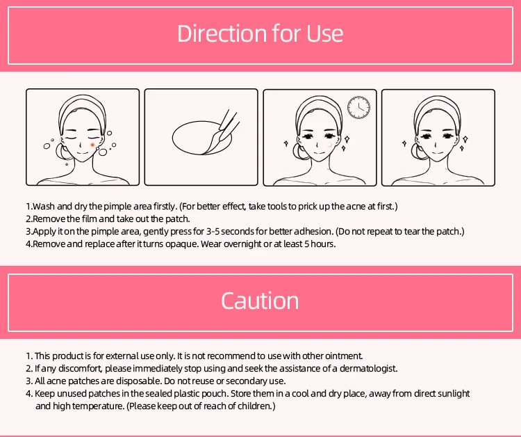 Direction for Use | 1.Wash and dry the pimple area firstly. (For better effect, take tools to prick up the acne at first.) 2.Remove the film and take out the patch. 3.Apply it on the pimple area, gently press for 3-5 seconds for better adhesion. (Do not repeat to tear the patch.) 4.Remove and replace after it turns opaque. Wear overnight or at least 5 hours. |