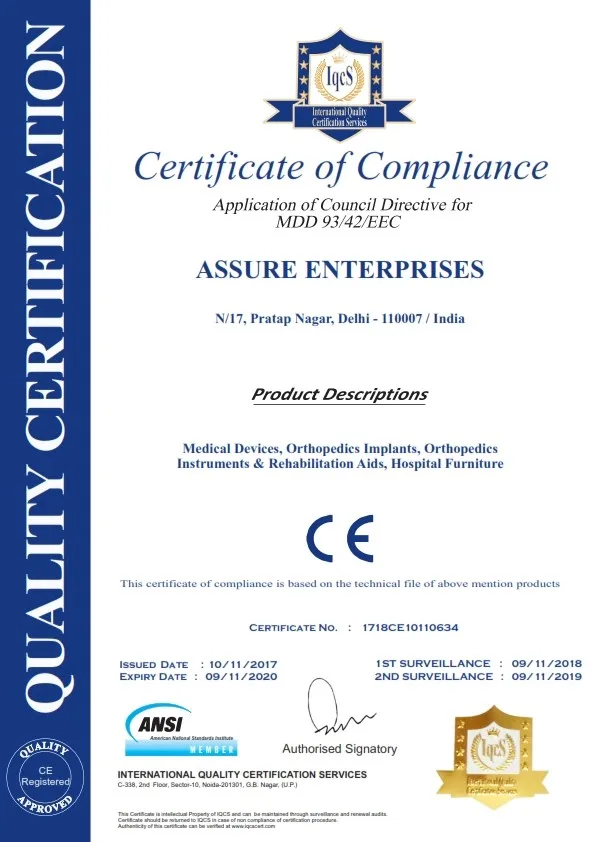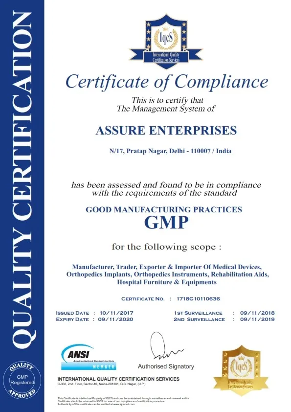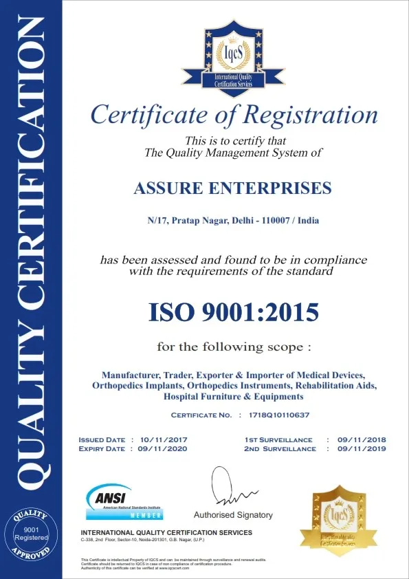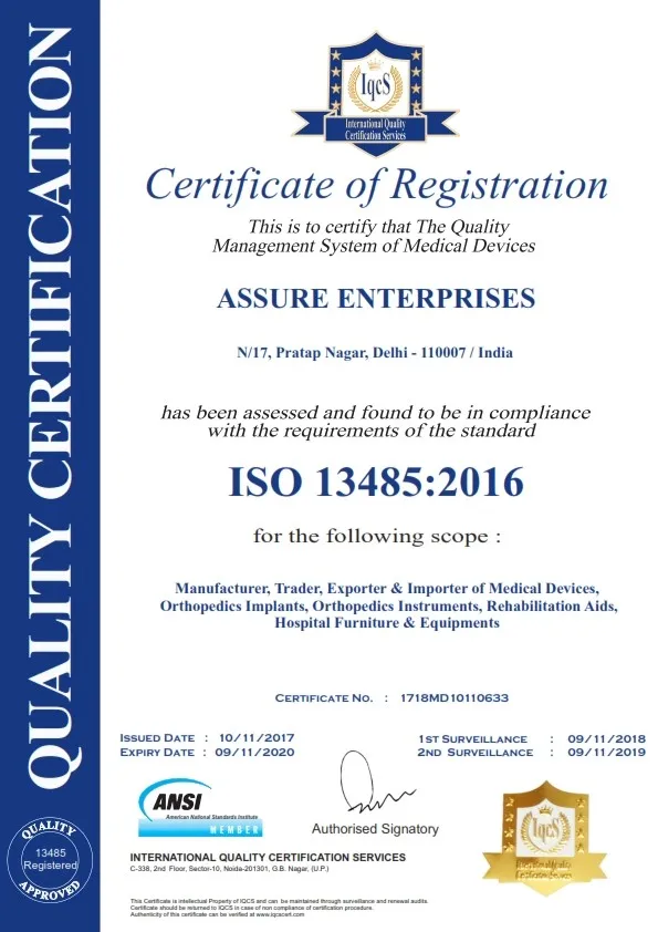 We are Assure Enterprises engaged in the manufacturing and export of high class Orthopedic Implants and Orthopedic Instruments. For several years, we have been supplying quality goods at competitive prices to various Medical Institutions, International Export etc. We are holding all quality certificates like ISO:13485, GMP, CE.