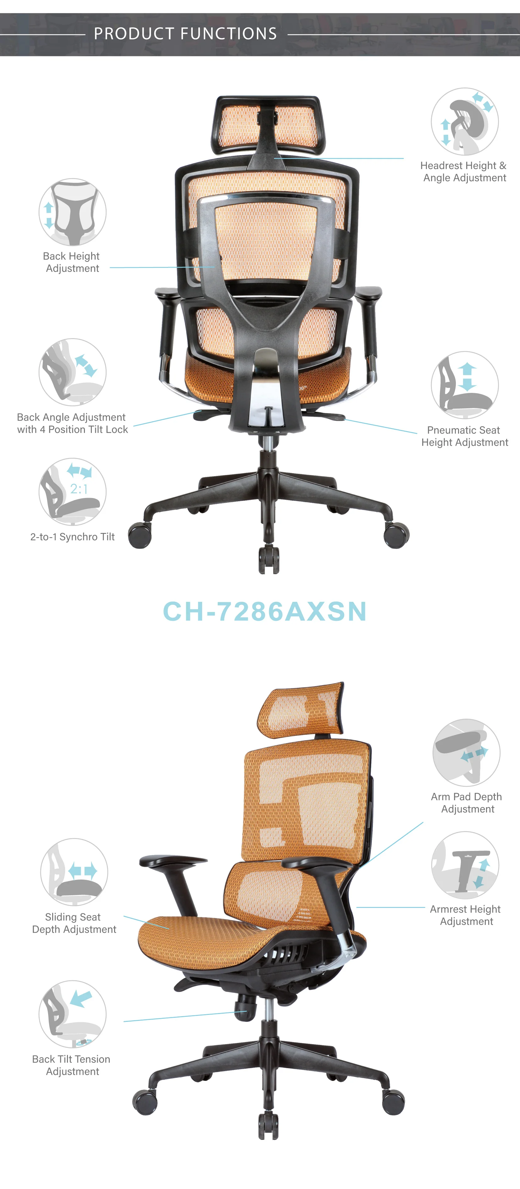 Functions | Headrest Heaight & Angle Back Angle & Heaight Seat Height & Depth Armrest Height Arm Pad Depth |