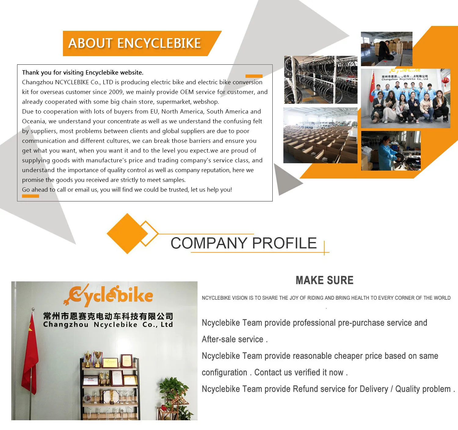 Changzhou Ncyclebike Co.,Ltd.is a professional manufacturer of Electric bike kits,integrating development and production together. Our main products include hub motor,electric bike kits,lithium battery,electric bicycle and related products.Our company was established in 2016.Located near shanghai,we enjoy convenient water,land and air transportation. Ncyclebike will initiate the second phase of our development strategy.Our company regards"reasonable prices.efficient production time and good after-sales service"as our tenet.We hope to cooperate with more customers for mutual development and benefits.We welcome potential buyers to contact us.