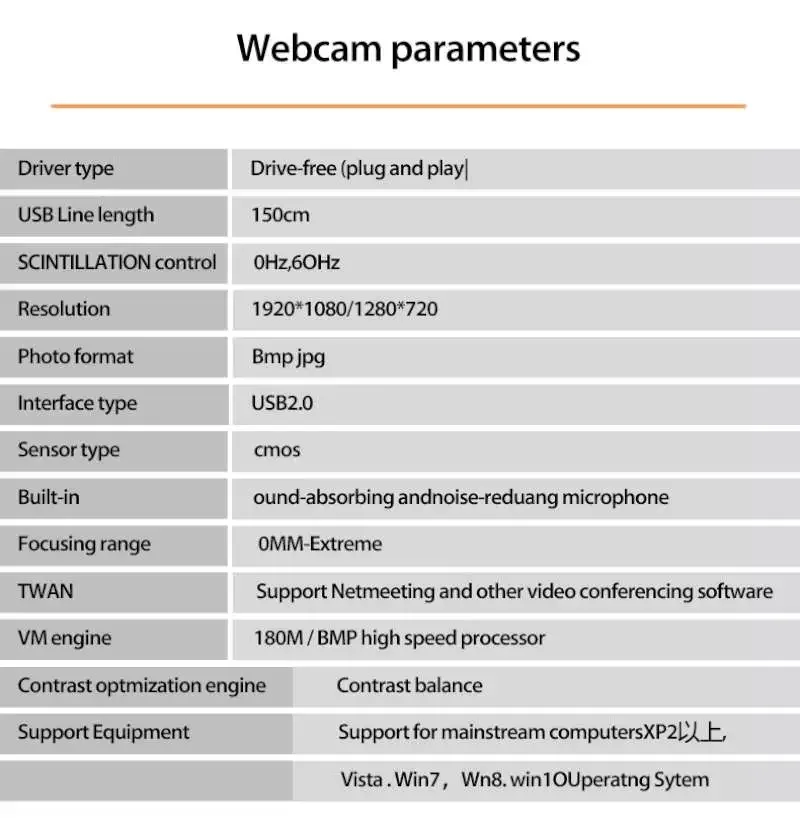 Specifications: DSP chip: Driverless Image sensor: CMOS Lens: Superior quality glass lens High definition: 12.0M pixels Dynamic resolution: 640x 480/1920*1080 Frame rate: 30fps Line length: 140cm Item dimension: 8 x3 x 11cm / 3.15 x1.18 x4.33in