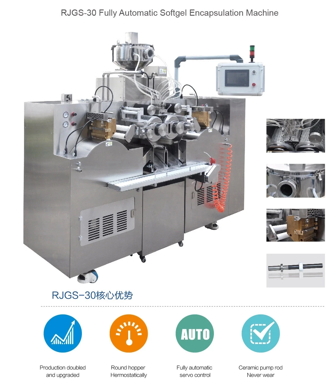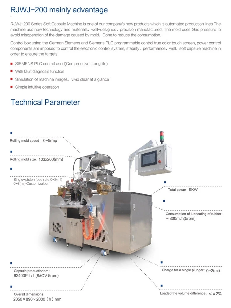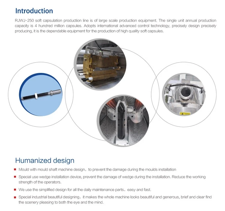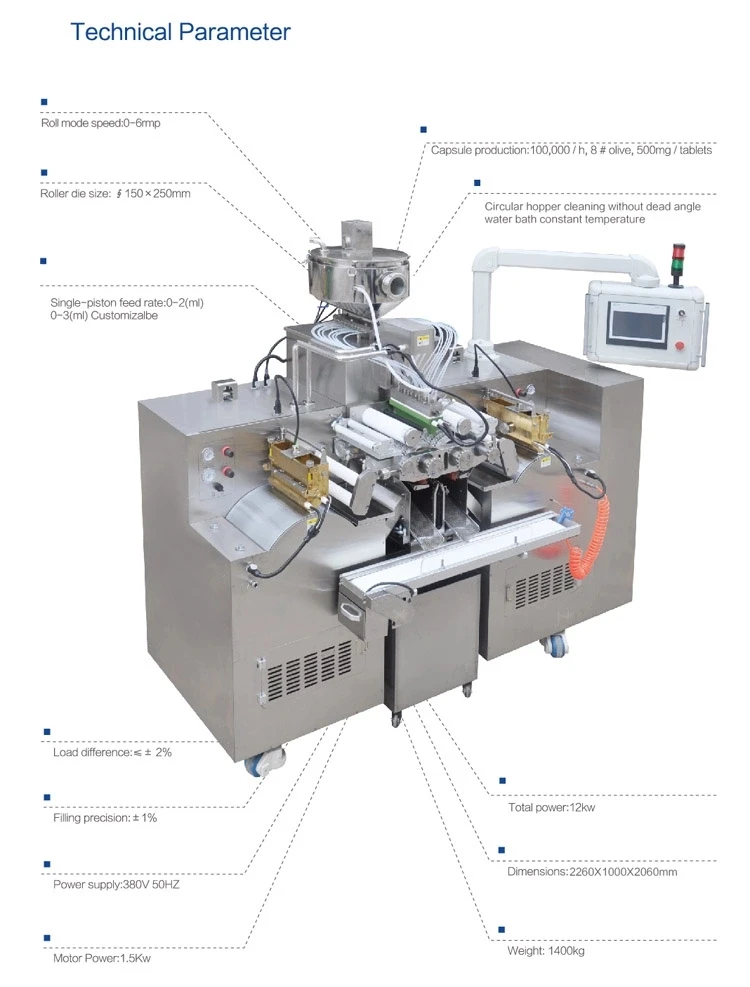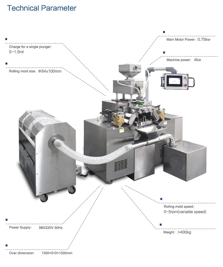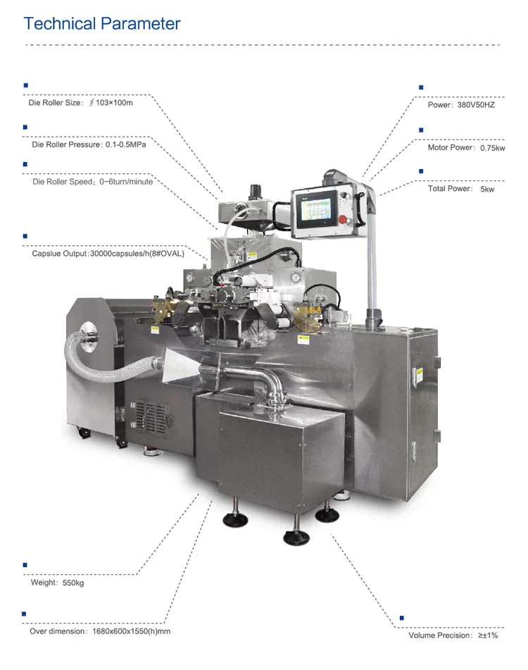 Capsule fast shape fixing: special air blow device, reduce the temperature of capsule output part. Easy for the capsule shape fixing. Temperature control material hopper precise temperature control, auto liquid level control, it is suitable to various kinds of material requirements.