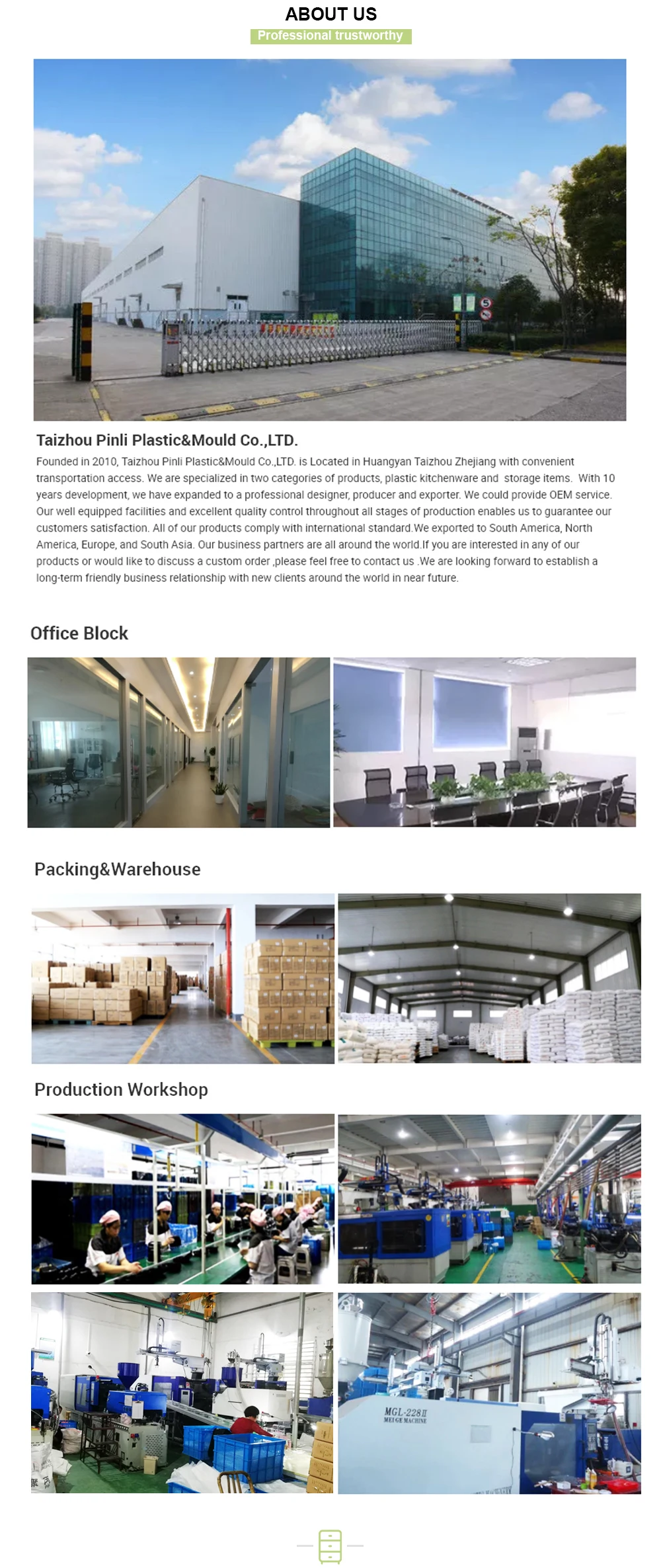 A: We are based in Zhejiang, China, start from 2010,sell to Domestic Market(25.00%),Africa(15.00%),Mid East(15.00%),North America(15.00%),South Asia(10.00%),South America(5.00%),Southeast Asia(4.00%) Northern Europe(3.00%),Eastern Asia(2.00%),Central America(2.00%),Eastern Europe(1.00%),Southern Europe(1.00%),Oceania(1.00%),Western Europe(1.00%). There are total about 11-50 people in our office.