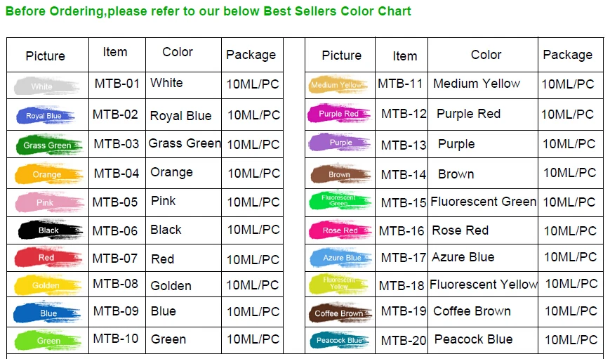 --10ml/0.34oz per pc --20colors/set --200ml/6.7oz per set --60sets/Carton