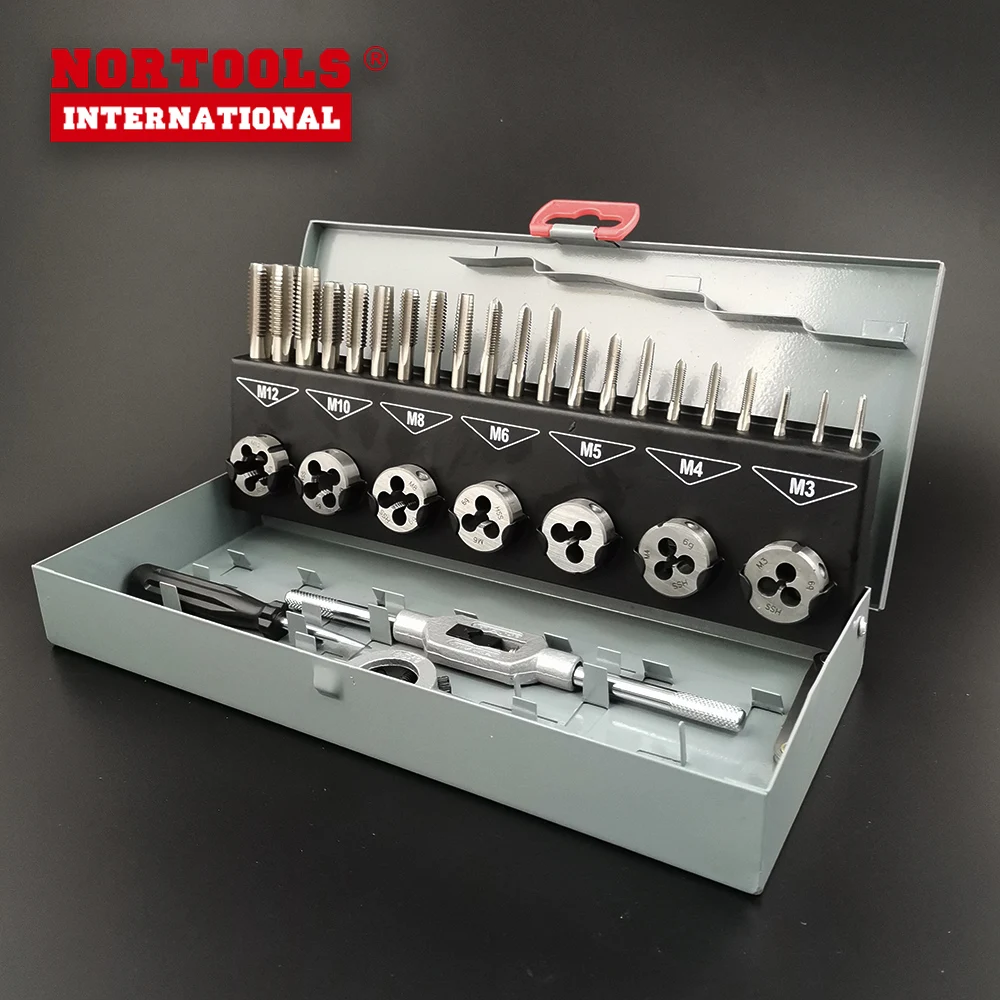 32pcs Taps&Dies SET -21pcs Hand taps DIN352 3pcs/set M3-M12 -7pcs HSS Round dies DIN223 25x9 M3-M12 -1pc Tap wrench DIN1814 NO.1-1/2 -1pc Die Holder DIN225 25X9 -1pc Pitch Gauge -1pc Srewdriver | ||
