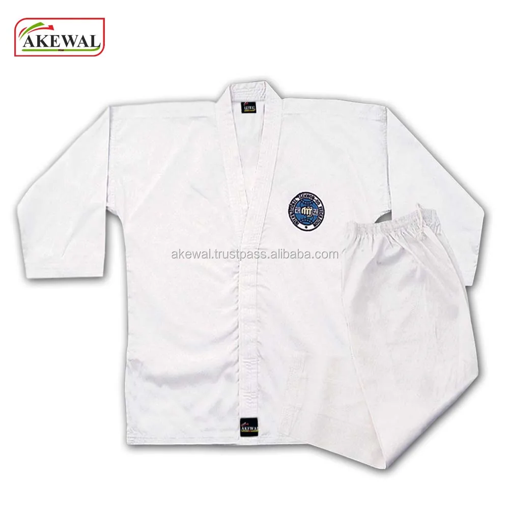 MATERIAL | ITF Uniform Made of 65% Cotton 35% Polyester (Also Available in 100% Cotton) Medium weight 8.5-OZ (290Gms) with ITF Printing on back and on front embroidered badge Trouser elastic waist . With white belt. |