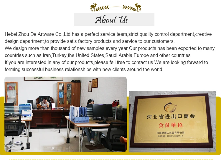 Hebei Zhou De Artware Co,.Ltd. has a complete service team and strict quality control . Department,creative design department,providing satisfactory products and services to our customers.