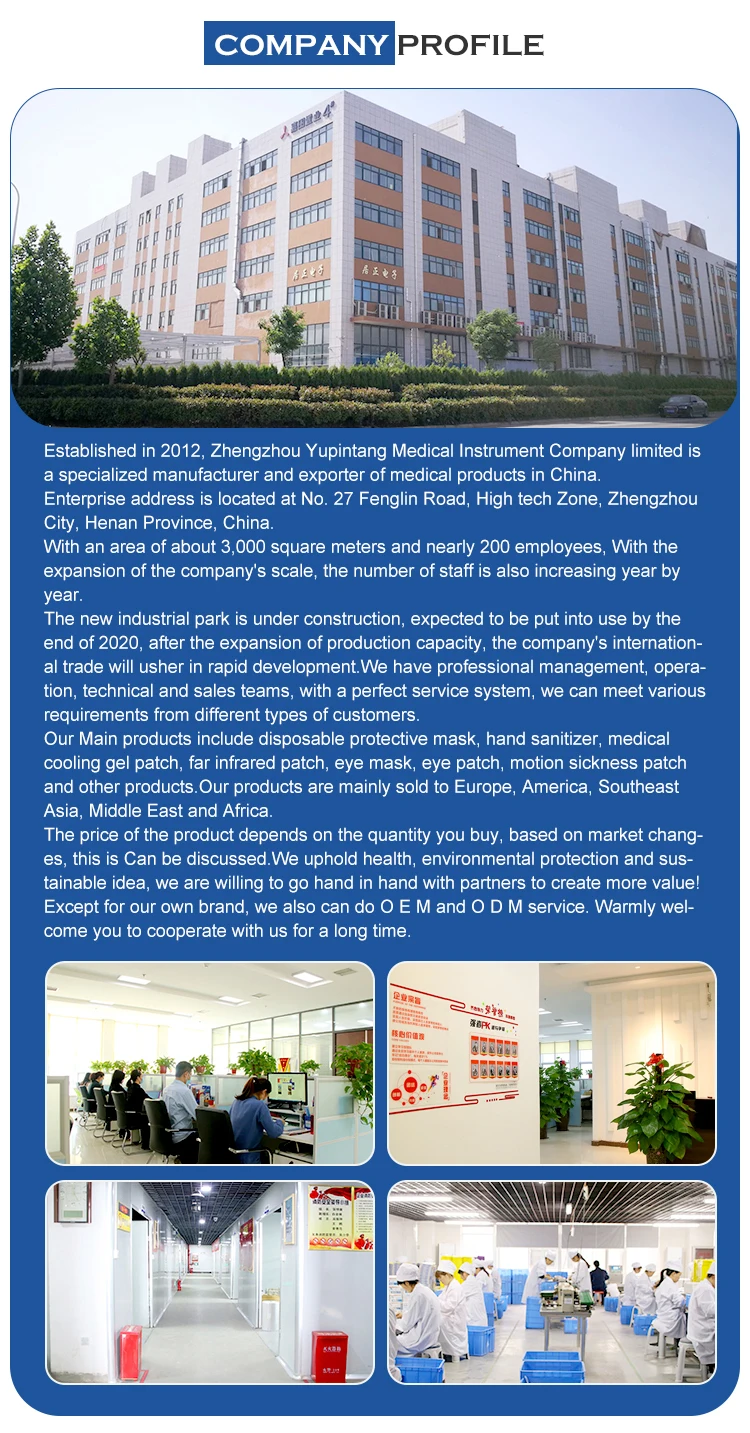 Our main products contain face mask, pain relief patches, far infrared patch, cooling gel patch, capsicum plaster, diabetic patch, eye patch, foot patch, motion sickness patch, multivitamin, probiotic powder and other health products.
