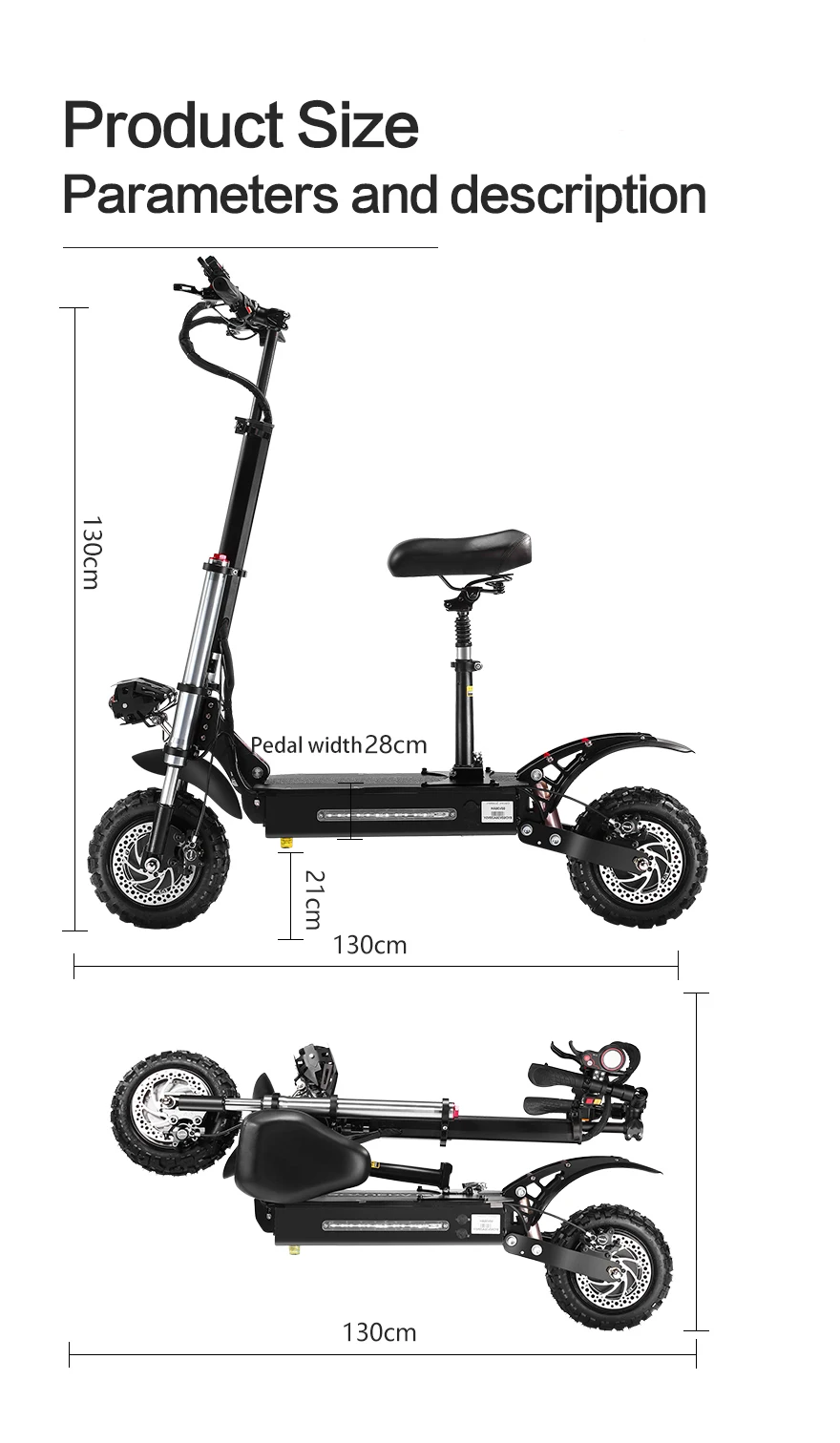 Material: Enhanced body aluminum alloy Tire: 11 inch off-road vacuum tire Maximum load: 150kg Motor power: 60V5400W (single motor 2700W dual drive dual motor) Battery parameters: 60V 32Ah Vehicle weight: about 40KG Endurance: 100 km Brakes: front and rear dual oil disc brakes + EBAS electronic brakes Front shock absorption:dual locomotive competition level with hydraulic front shock absorption Rear shock: high-end damping hydraulic shock Controller: Dual 60V45A controller Pedal width: 28CM Chassis height: 21CM Expanded size: 123*28*130cm Folding size: 130*28*45cm USB charging port: the meter has a USB mobile phone charging port Charger: 2 x 3A charger (dual charging port) Charging time: 6-8 hours Speed: First gear maximum speed:35km/h; Second gear maximum speed:65km/h; Third gear maximum speed:85km/hmelines, milestones, etc.