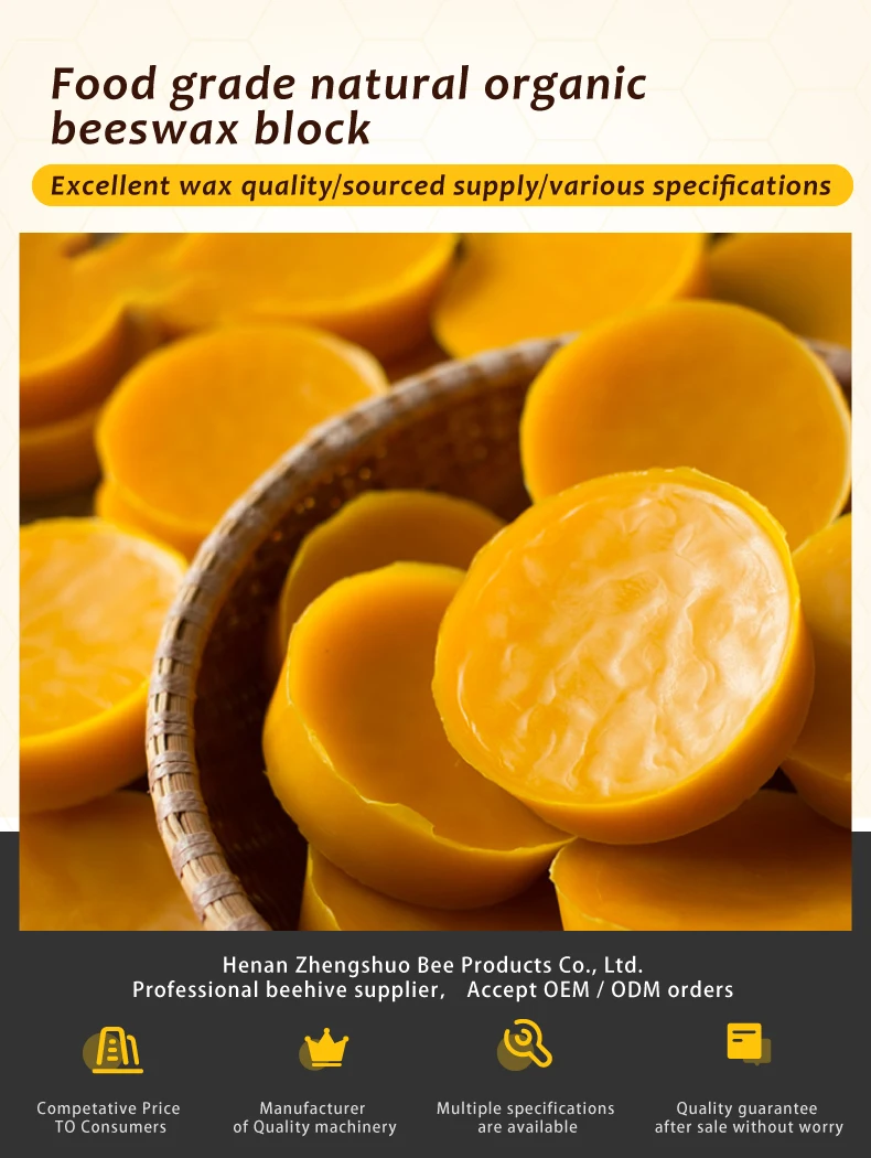 Yellow beeswax: honeybee secretions, raw wax without decolorization, pure yellow color, soft and slightly fragrant