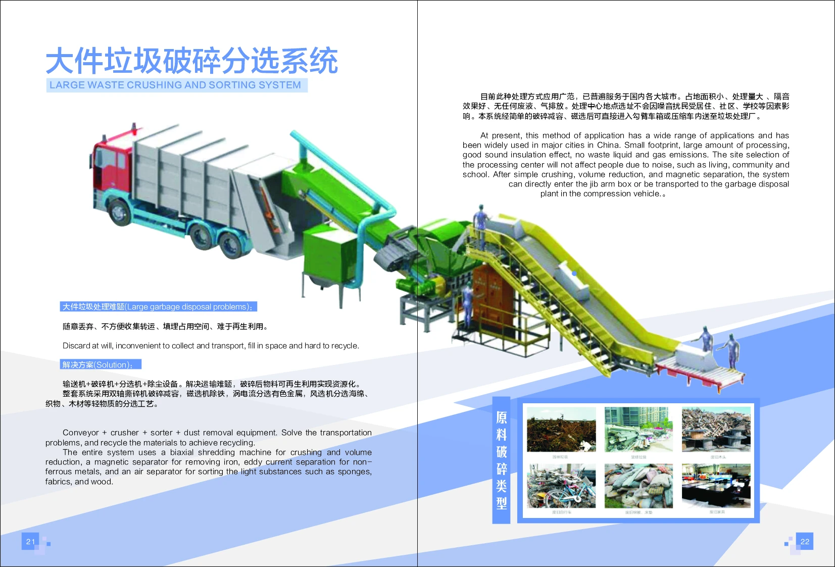 Small footprint,large amonut of processing,good sound insulation effect,no waste liquid and gas emissions.The site selection of the processing center will not affect people due to noise,such as leaving,community and school.After simple crushing,volume reduction,and magnetic sepration,the system can directly enter the jib arm box or be transported to the garbage disposal plant in the compression vihicle.