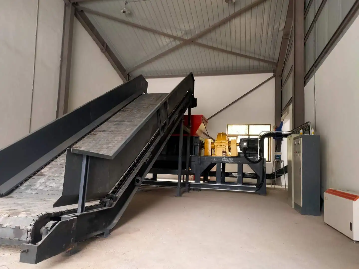 The entire system uses a twin shaft shredding machine for crushing and reducing volume,a magnetic seprator for removing iron,eddy current seprator for non-ferrous metals,and an air seprator for sorting the light substances such as sponges,fabrics,and wood.