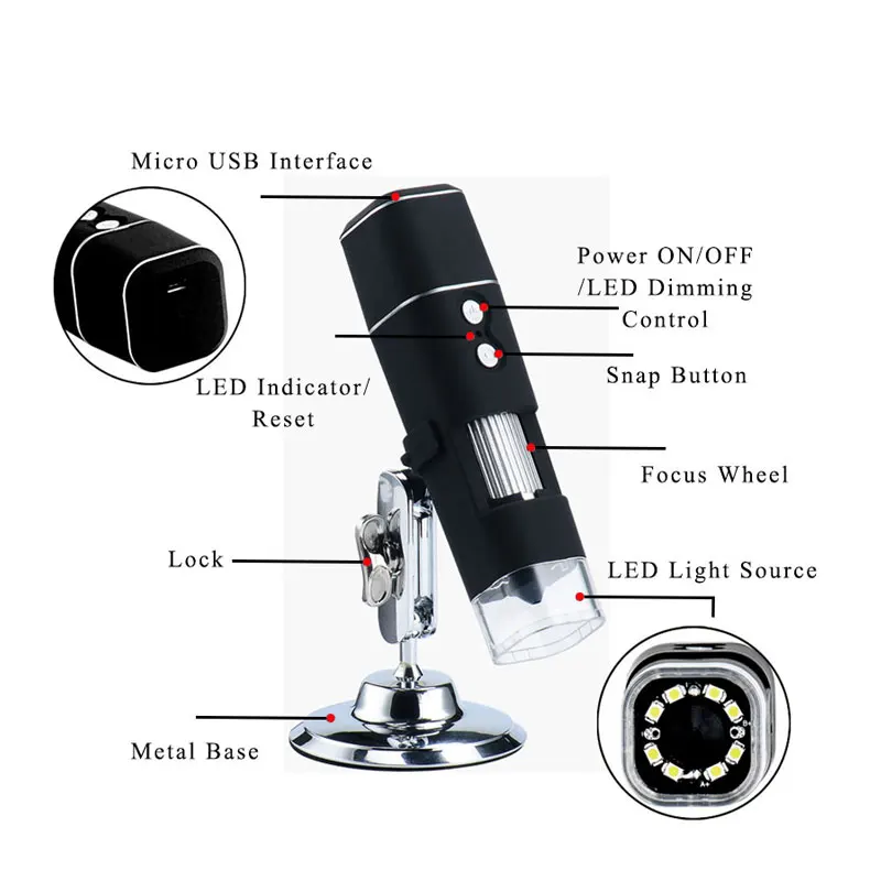 H01 Handheld Digital Microscope is a super portable instrument for gem identification, electron inspection, medical treatment, and teaching demonstration. Its magnification ranges from 50X to 1000X and integrated Wifi function, which offers more convenient operation.